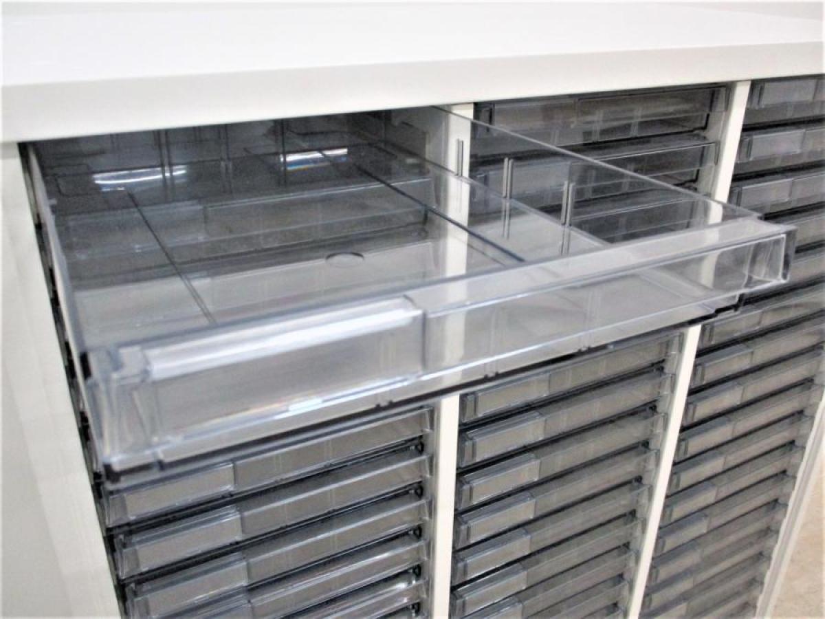 【書類・備品整理の必需品!書類や備品のストックにピッタリ!※1段目のみ浅型仕様】オカムラ レクトライン クリスタルトレー 書類 引き出し 透明 ケース ローキャビネット 整理 中古家具 オフィス家具 福岡 九州最大級《オフィスバスターズ福岡博多店は、福岡を拠点として、日本全国へ中古オフィス用品・オフィス家具を提供しております》