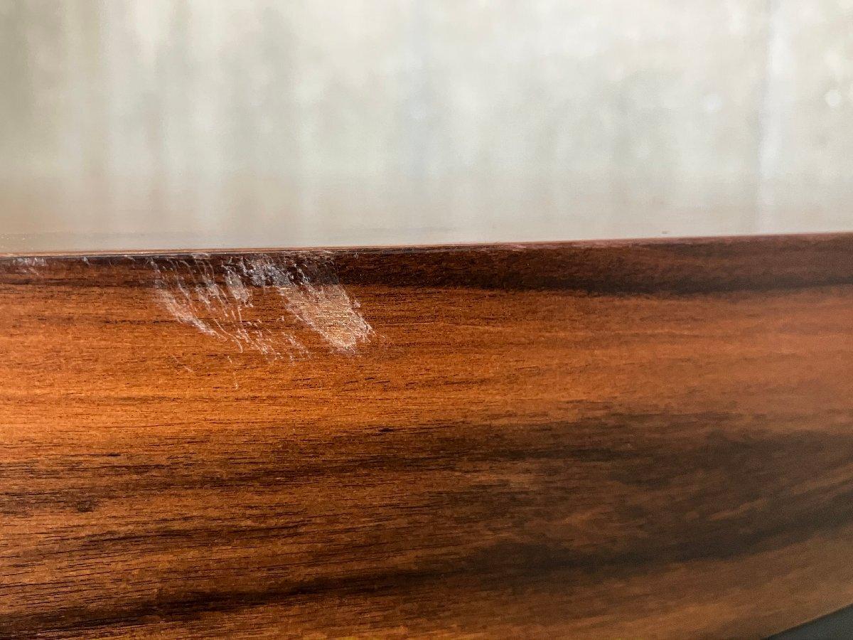 - あり黄ばみ・変色が広い範囲にうっすらある、または濃い黄ばみ・変色が一部ある。(例、天板、幕板、棚板、サイド部分、脚部等にある。)
