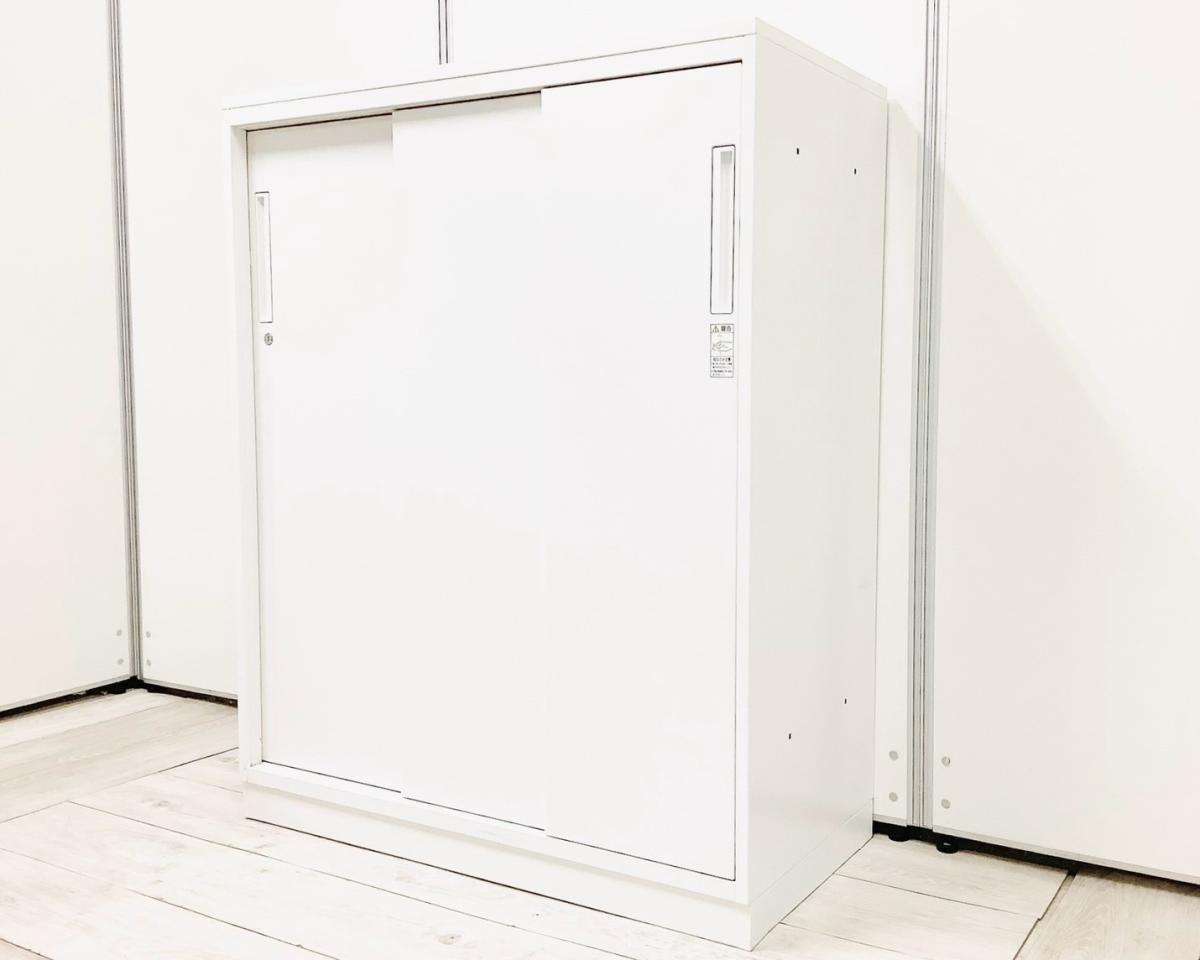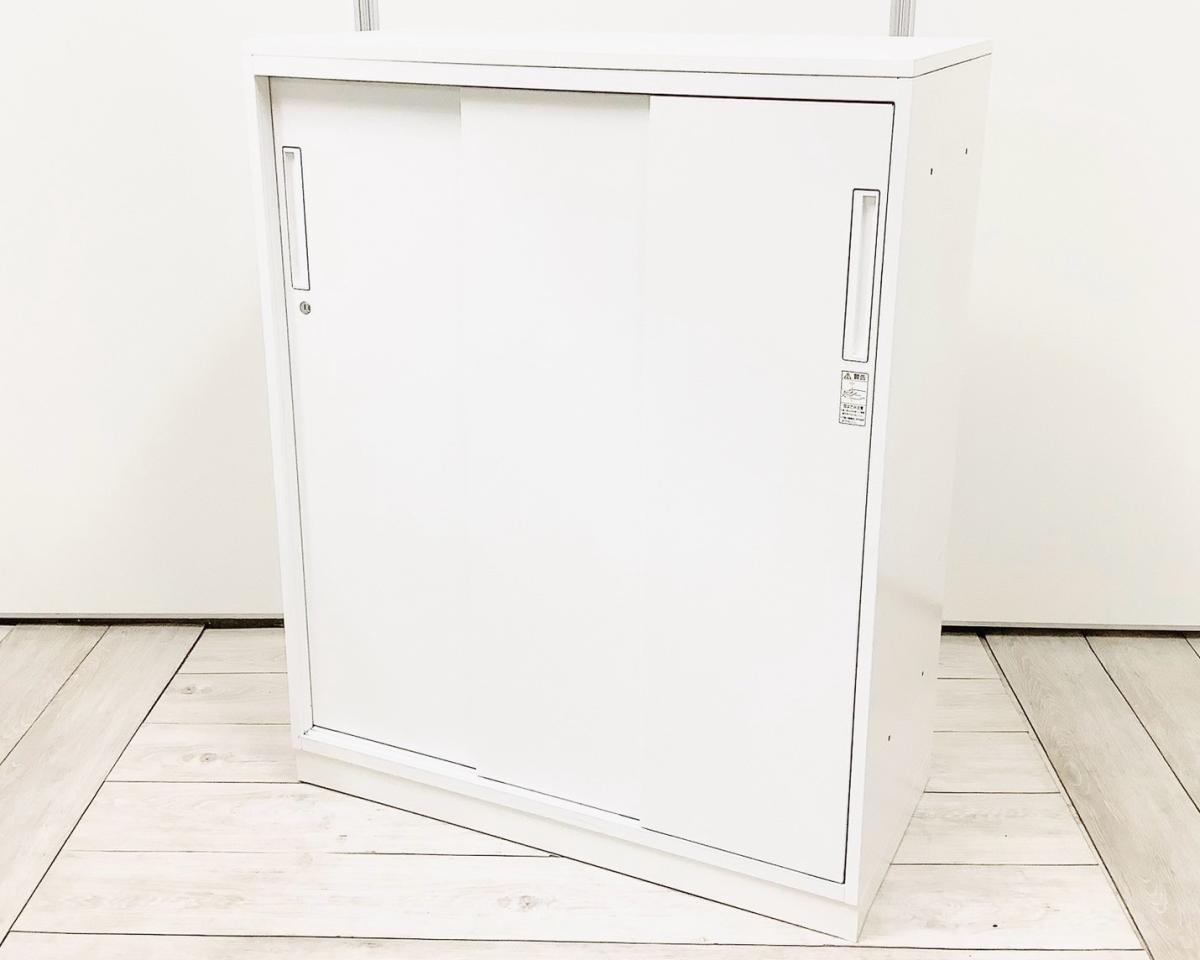 【スライド引き戸だから開閉スペースに困らない!】■コクヨ(KOKUYO)製 エディア(EDIA)シリーズ 2枚引き違い書庫 ローキャビネット シリンダー錠 天板付き ベース付き ホワイト シリンダー錠 収納 中古家具 格安 福岡 オフィス家具 九州最大級《オフィスバスターズ福岡博多店は、福岡を拠点として、日本全国へ中古オフィス用品・オフィス家具を提供しております》