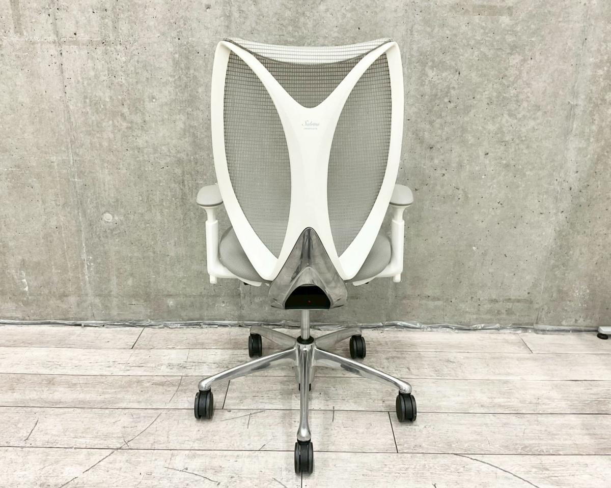 【前傾チルト付!流れるような美しいフォルムの最高級メッシュチェア!】■オカムラ(okamura)製 Sabrina(サブリナ)チェア 肘付ハイバック ■アジャストアーム(可動肘) ■背面メッシュ ■ライトグレー × ホワイトフレーム
