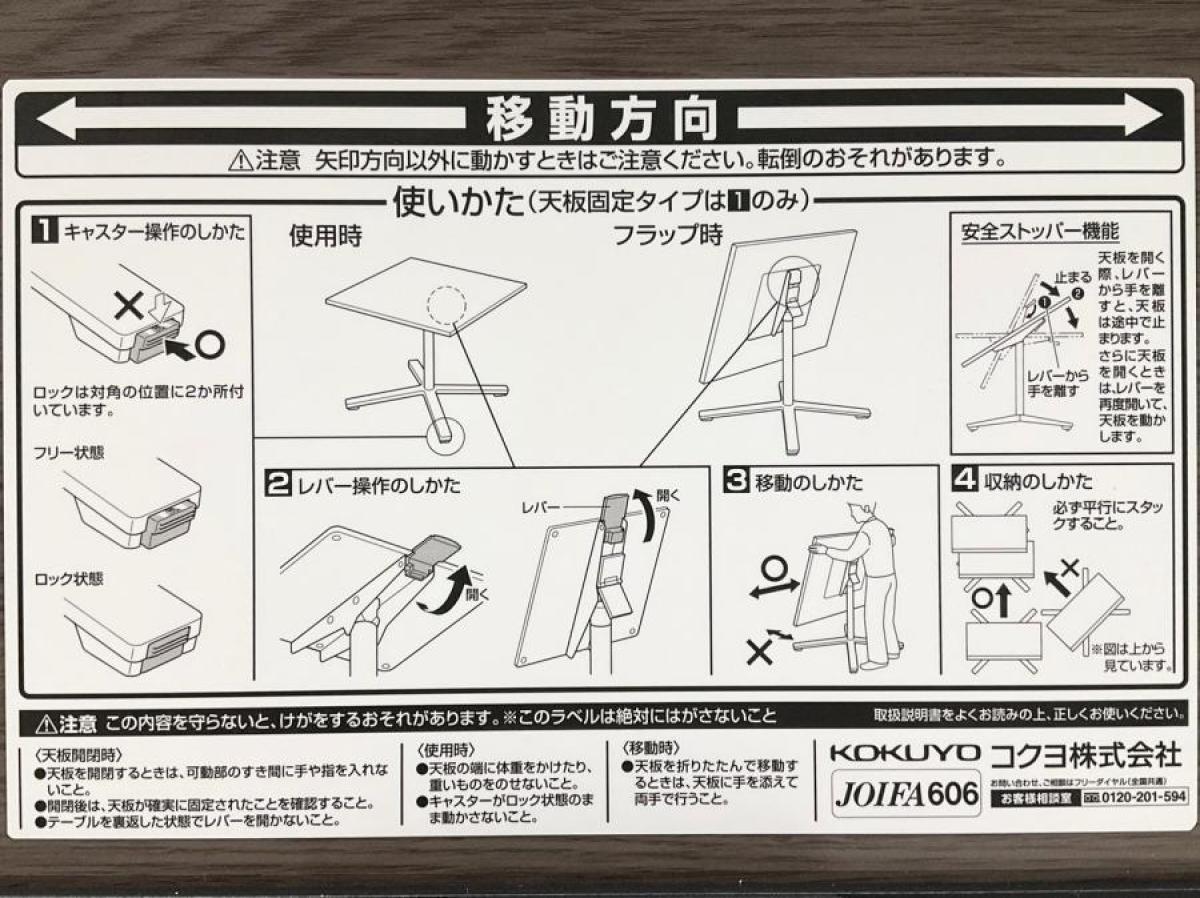 - 一部不具合あり天板歪み、アジャスター無し、キャスター使用不可ようなそのテーブルの本来の効用を果たすための機能以外の一部が使用不可な状態。(例、キャスターロッ ク機能使用不可、棚板無し等がある。)
