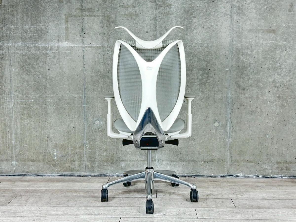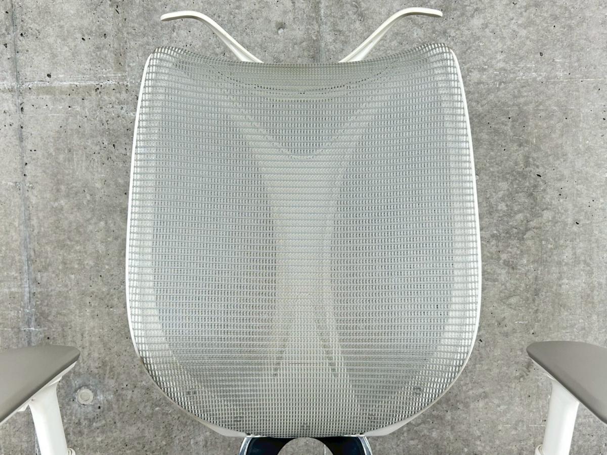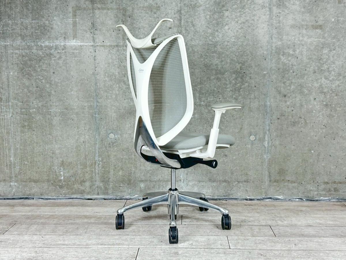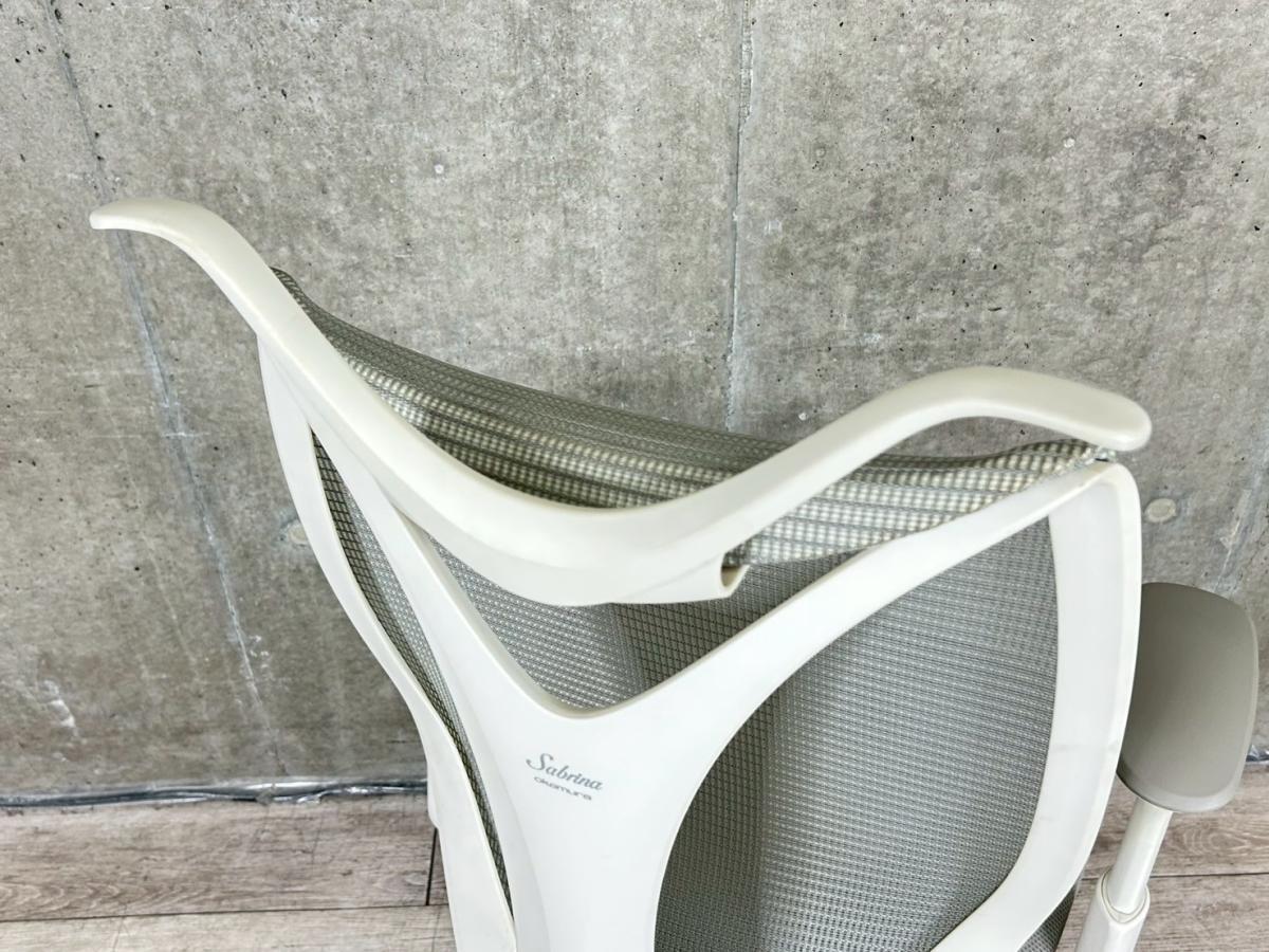 【前傾チルト付!流れるような美しいフォルムの最高級メッシュチェア!】■オカムラ(okamura)製 Sabrina(サブリナ)チェア 肘付ハイバック ■アジャストアーム(可動肘) ■背面メッシュ ■ライトグレー × ホワイトフレーム