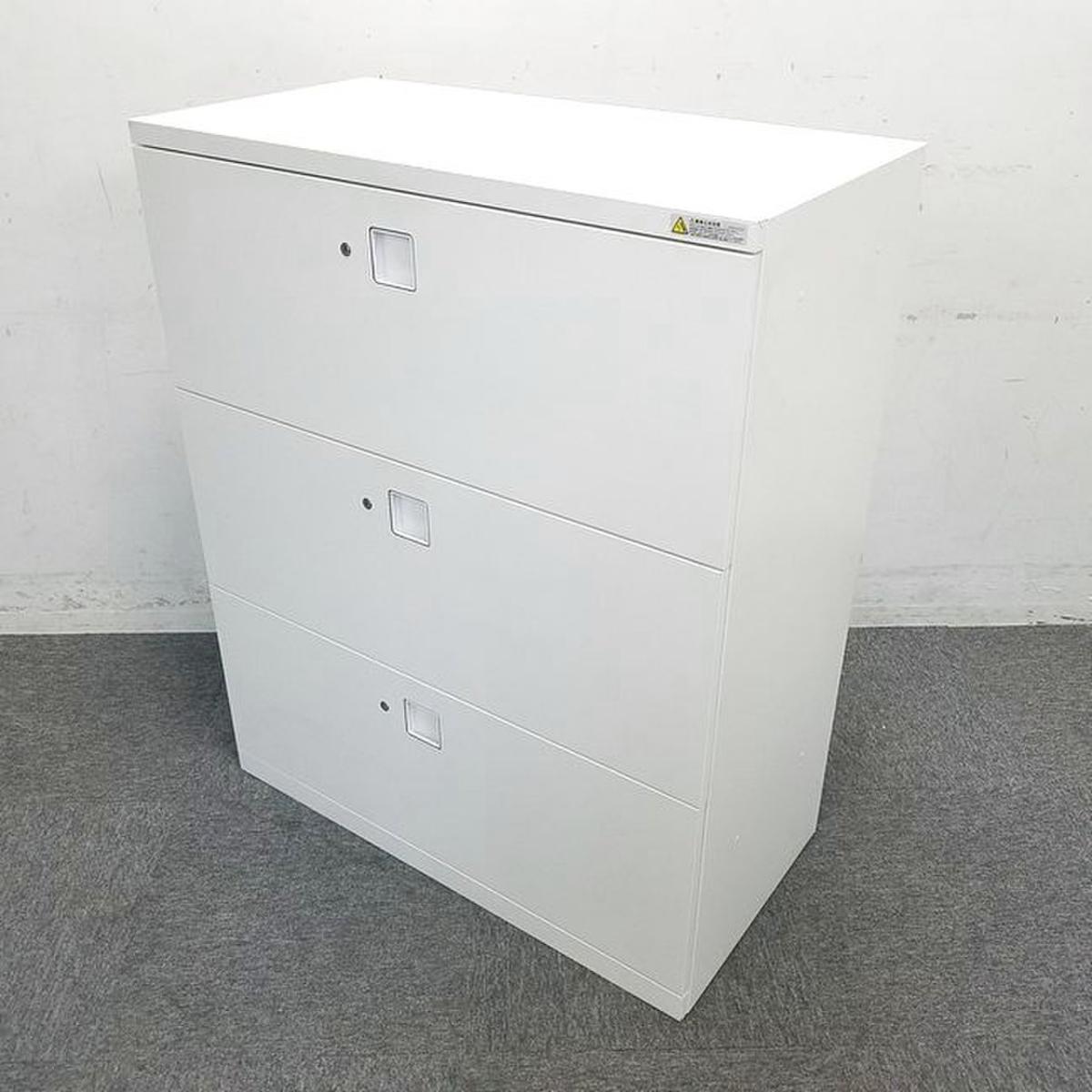 オカムラ レクトライン 3段ラテラル書庫 ホワイト天板 シリンダー錠 鍵付き ※取っ手部分に若干日焼けあり