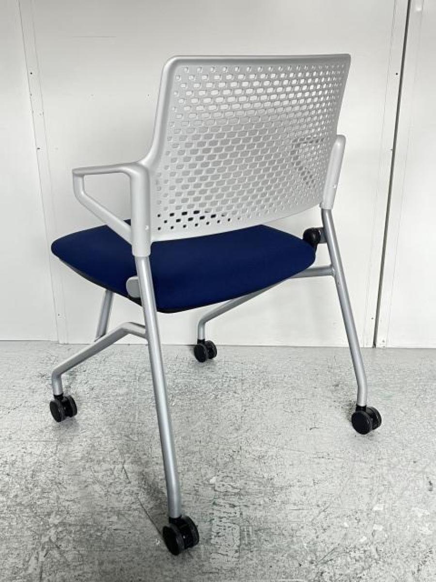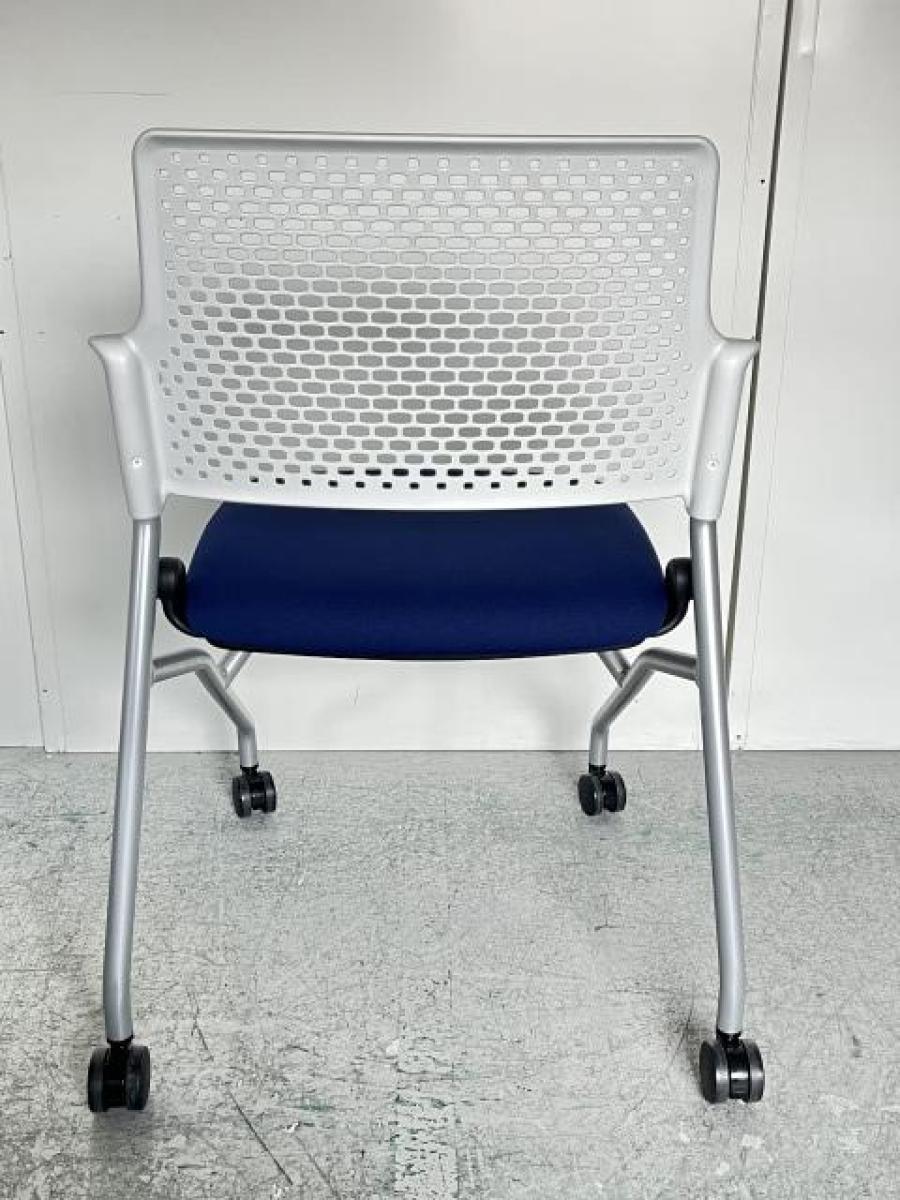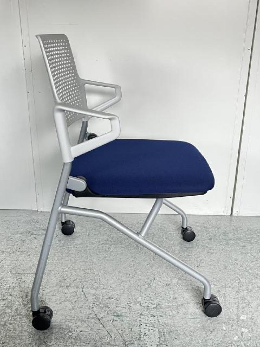 【折り畳んで収納!キャスター付で動作も楽々!】■ウチダ(UCHIDA)製 FM-345シリーズ 肘付 ネスティングチェア 会議用 キャスター付 ■背面樹脂メッシュ ■ブルー×ホワイトシェル