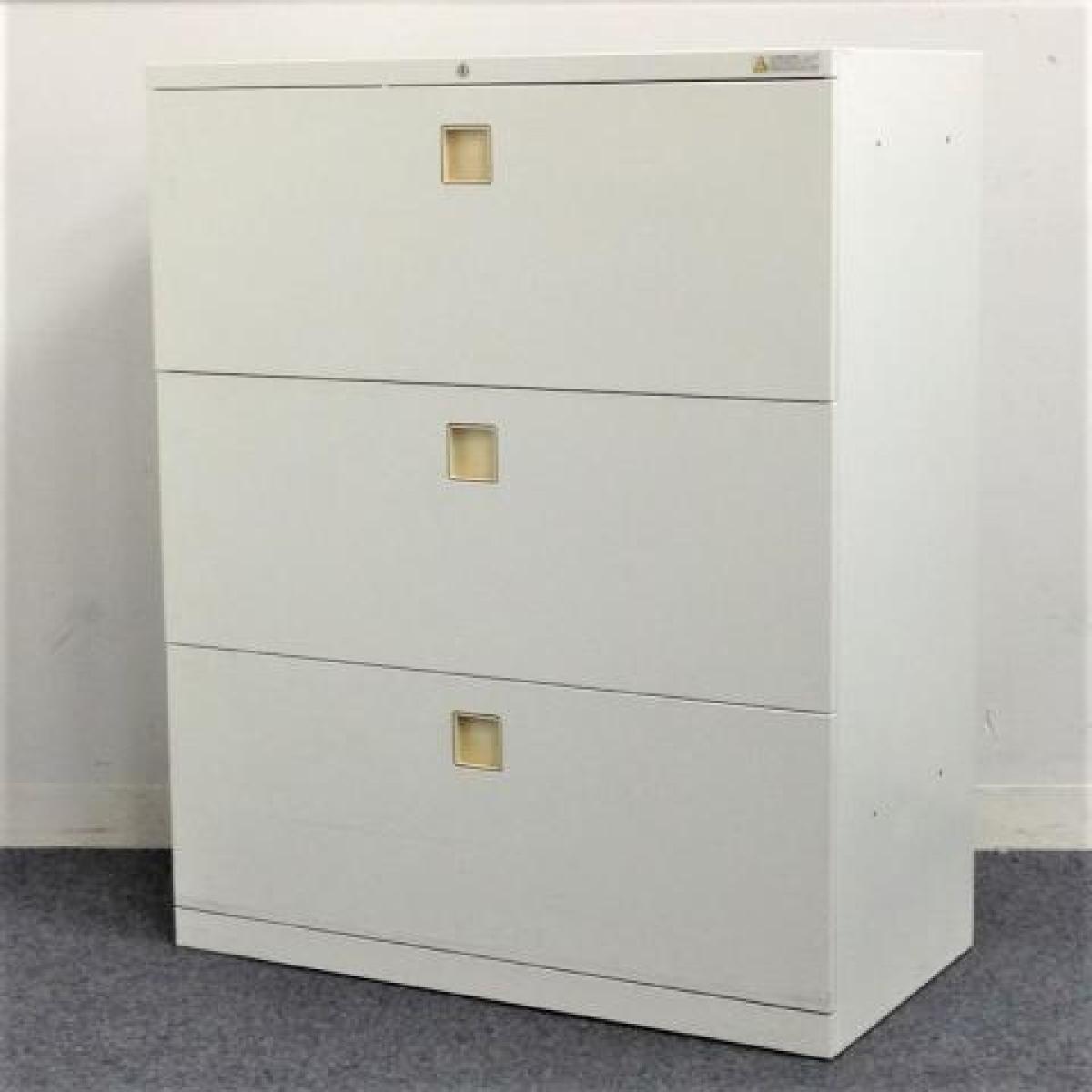 オカムラ レクトライン 3段ラテラル書庫 ホワイト天板 シリンダー錠 鍵付き ※取っ手部分に若干日焼けあり