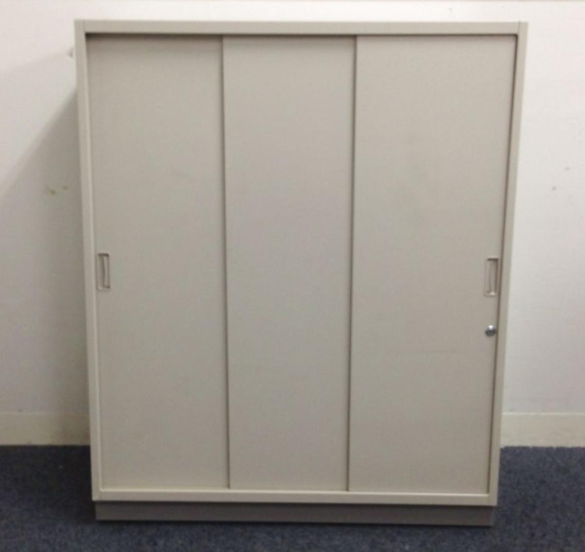 【スライド式なので開閉スペースに困りません!人気の3枚引き戸書庫!】■イトーキ (ITOKI)製 シンラインシリーズ 引き違い書庫 ローキャビネット 3枚引き戸 H1040㎜ ■グレー ■シリンダー錠 ※ベースなし