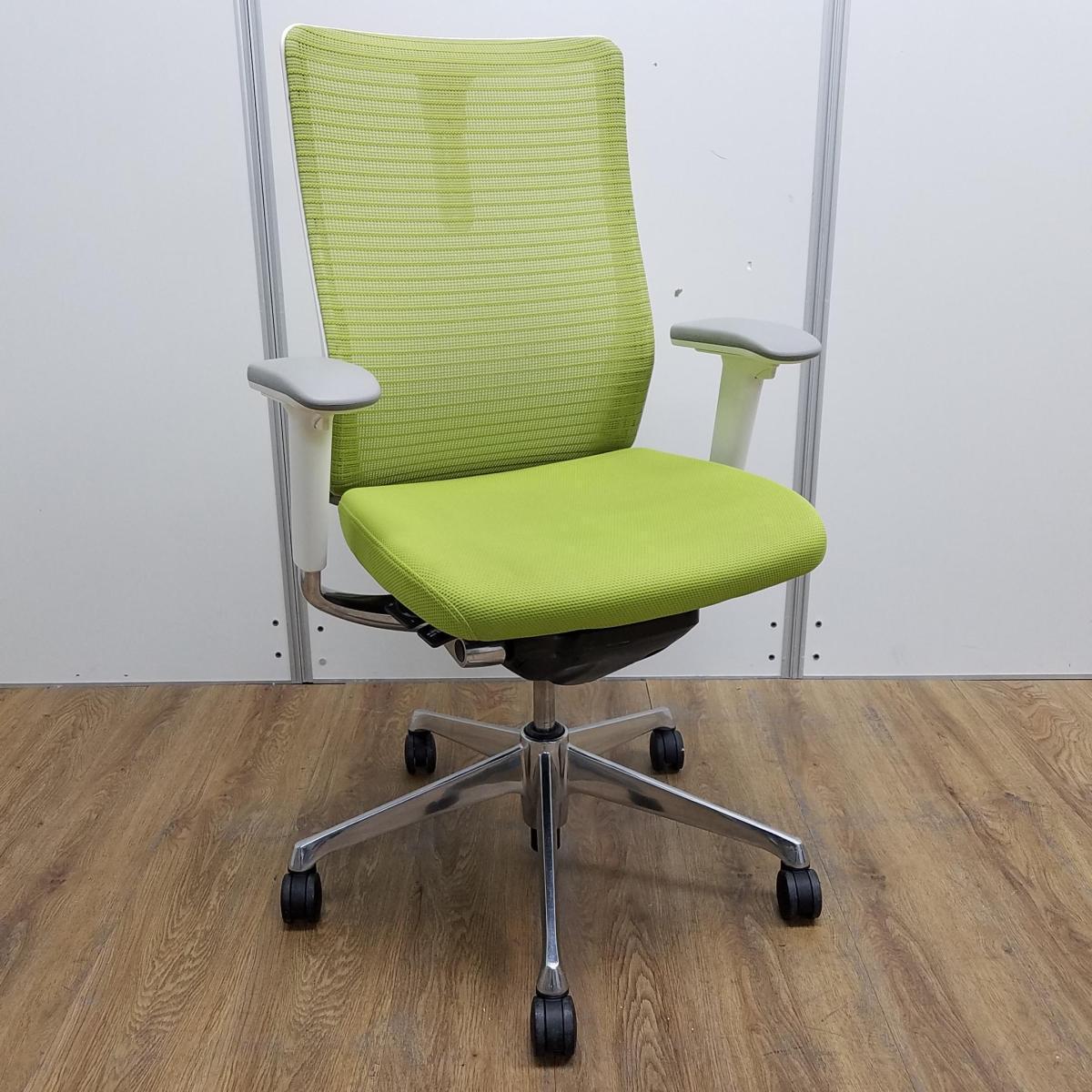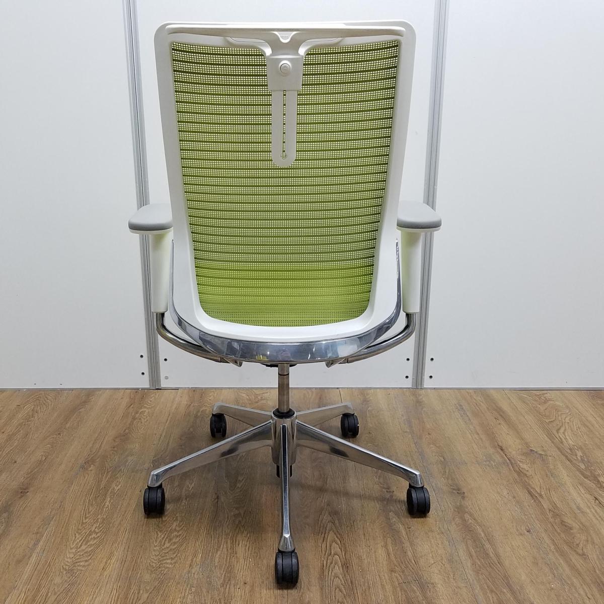 ★【T10】【商品入替のため、残り1脚限り】オカムラ製 コーラル(Choral) ライムグリーン ホワイトシェル ハイバック 肘付き メッシュ背面 アジャストアーム※可動肘 ハンガー付 どんな空間にも調和するデザインと最上級の操作性! 肘付きハイバックチェア!!【管理番号:A01024742】サーキュラーバリューCO2削減量の算出について