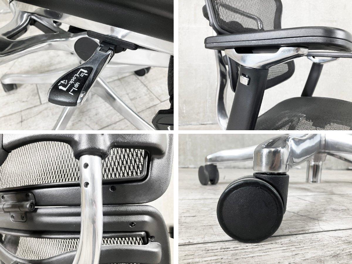 エルゴヒューマンのアイデンティティであるバックレストに組み合わされた独立したランバーサポート、高さ・前後・左右・角度を細かく調整できるアームレスト、剛性が高くスタイリッシュなアルミダイキャストフレーム等、エルゴヒューマンの初期からの特徴を継承しています。