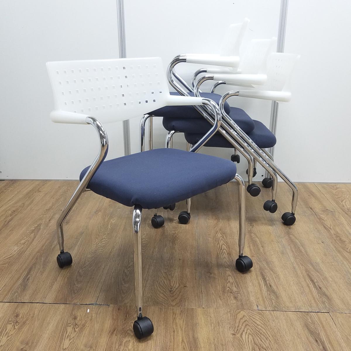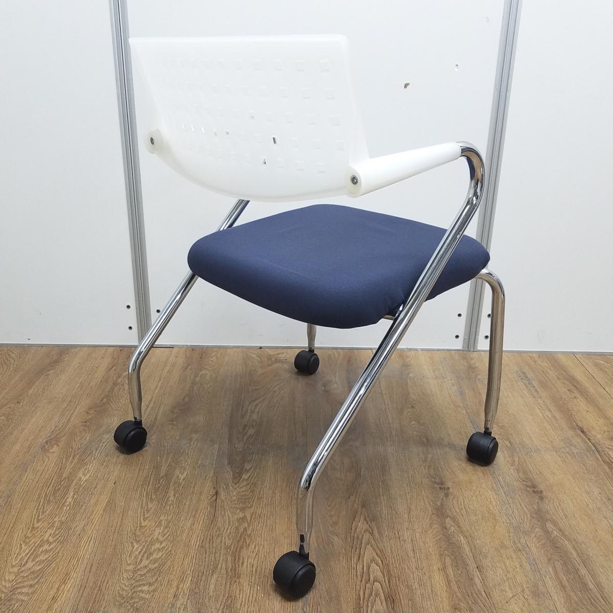 【4脚セット!!】ヴィトラ製 ビザロール ブルーxホワイト 背面樹脂メッシュ 固定肘 キャスター付 緩やかな曲線が疲れにくさを実現! 人気の高い高品質デザインチェア! ミーティングチェア!!- 京都東寺店