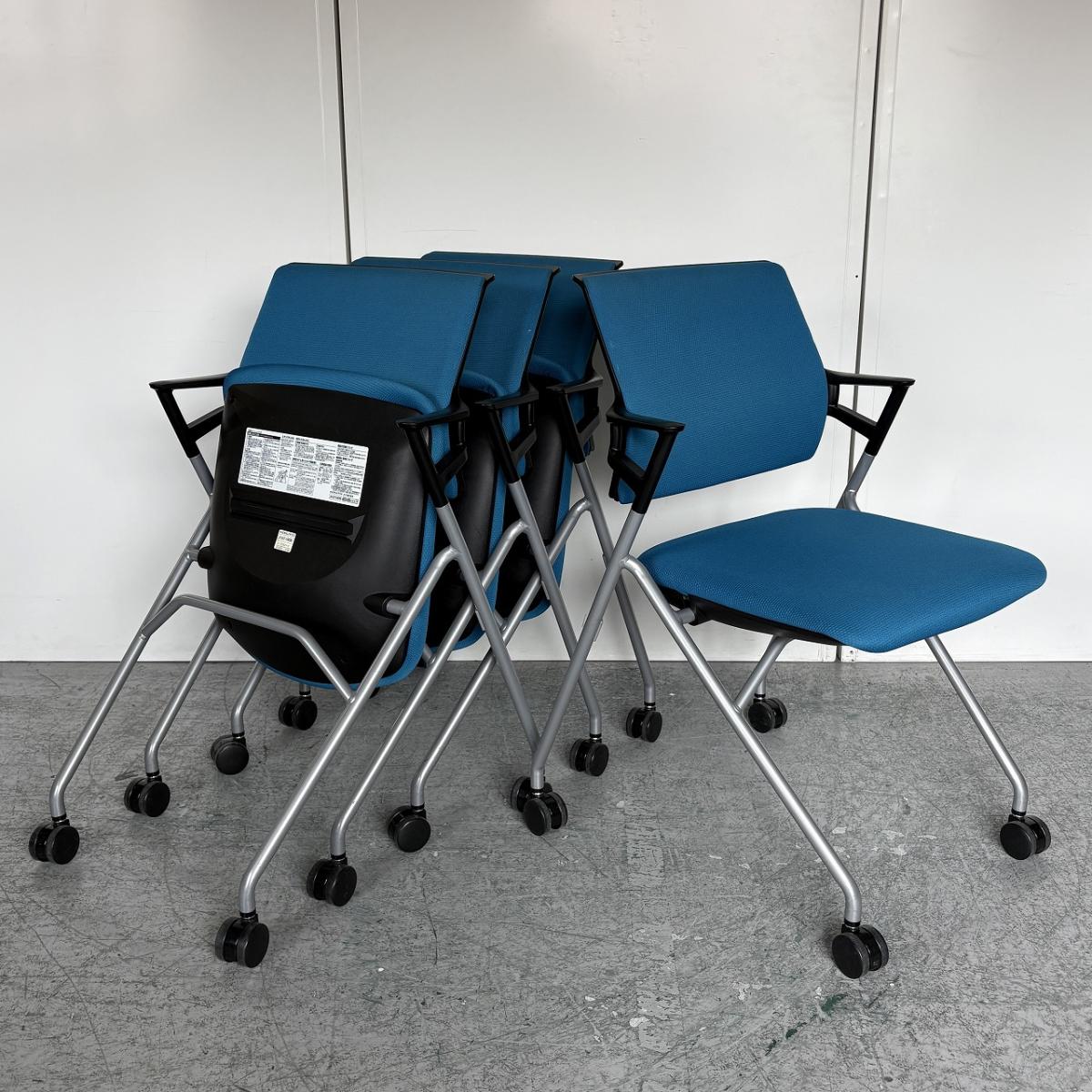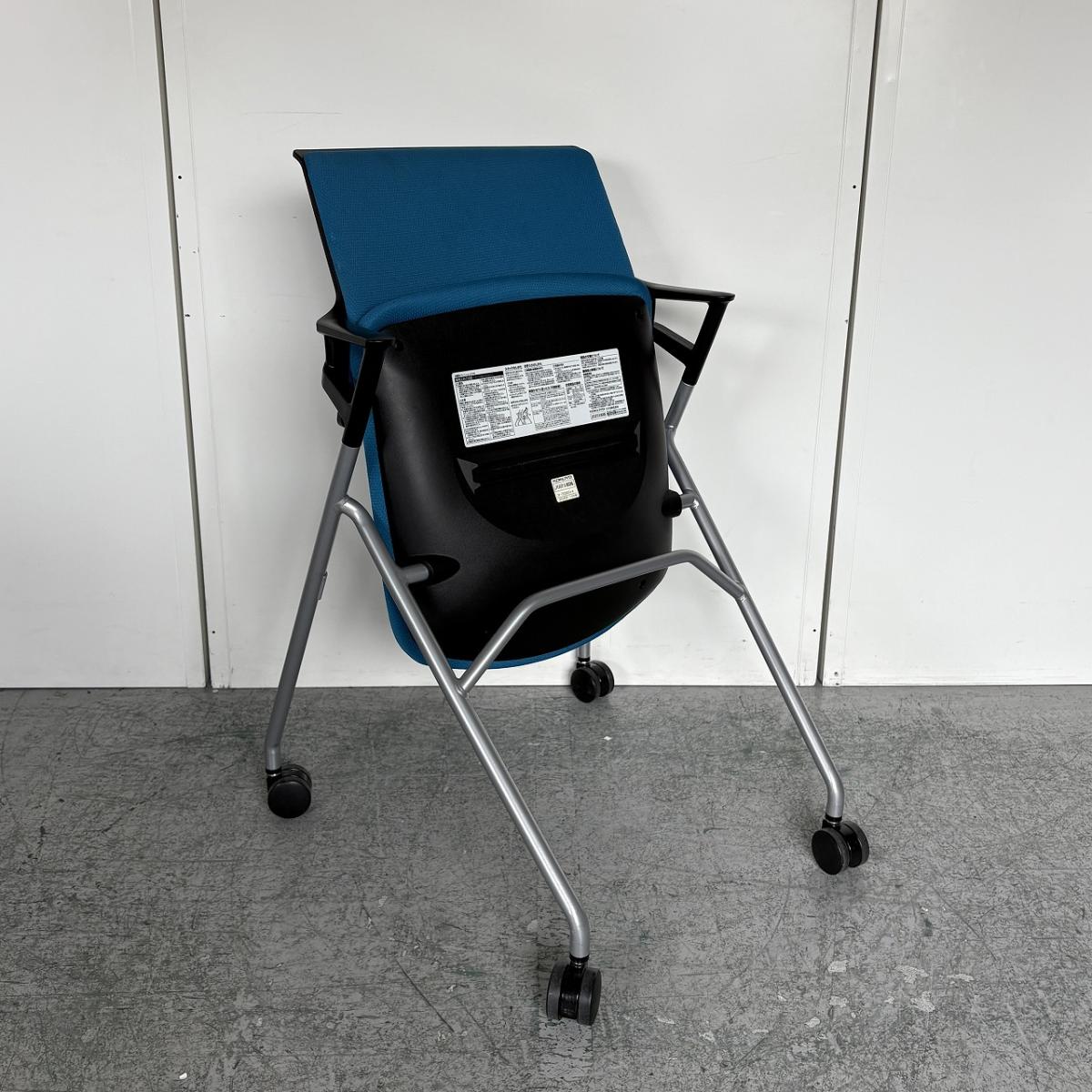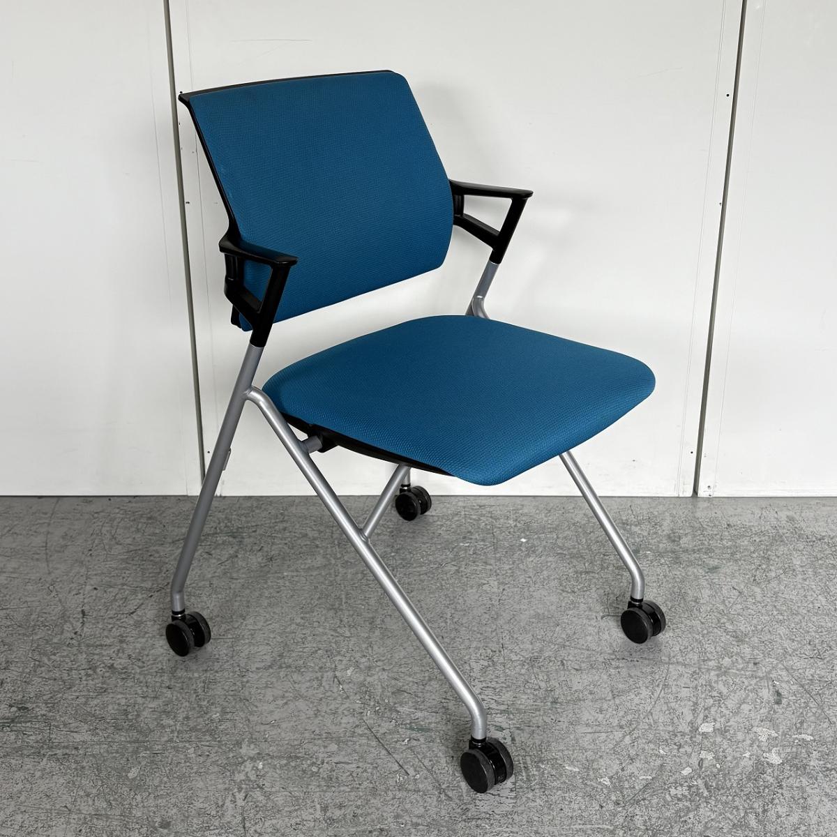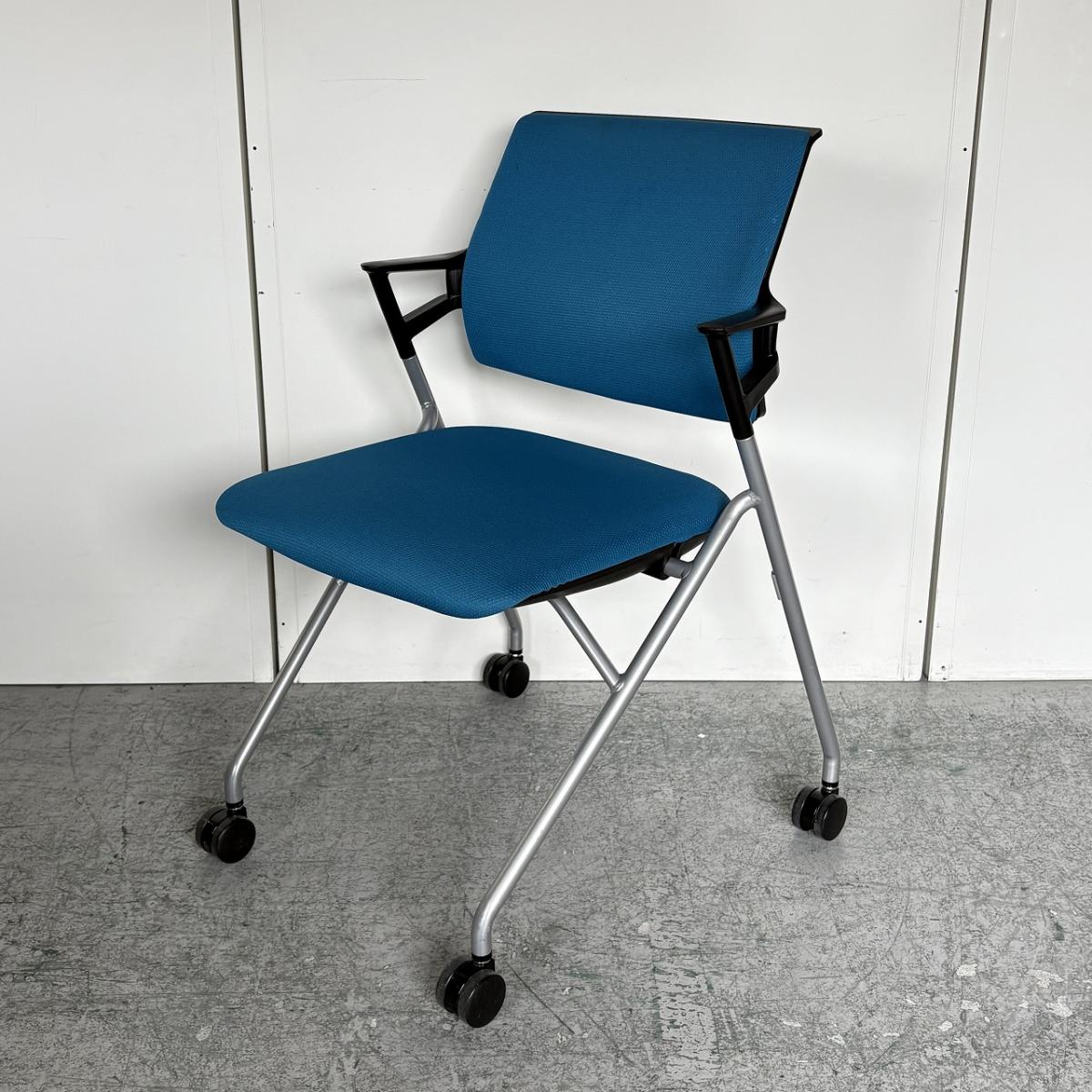 【定価約5万円】【使わない時は重ねて収納!肘付きで長時間の会議も安心の座り心地】■コクヨ(KOKUYO)製 ピエガシリーズ ネスティングチェア ミーティングチェア ■固定肘/キャスター付 ■背クッションタイプ ■ブルー×ブラックシェル- なんば日本橋店