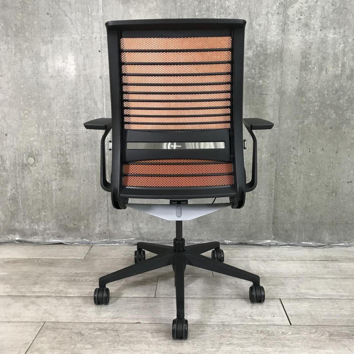 【定価約16万円】【ワイヤーが体にフィットするアメリカ発の大人気商品!長時間の着座ストレスを軽減!】 ■スチールケース(Steelcase)製 シンク(think)チェア 肘付き ハイバック ■メッシュバック ■固定肘/ランバー付 ■背面:オレンジ/座面:ブラック〈岐阜・愛知・三重・静岡・福井〉