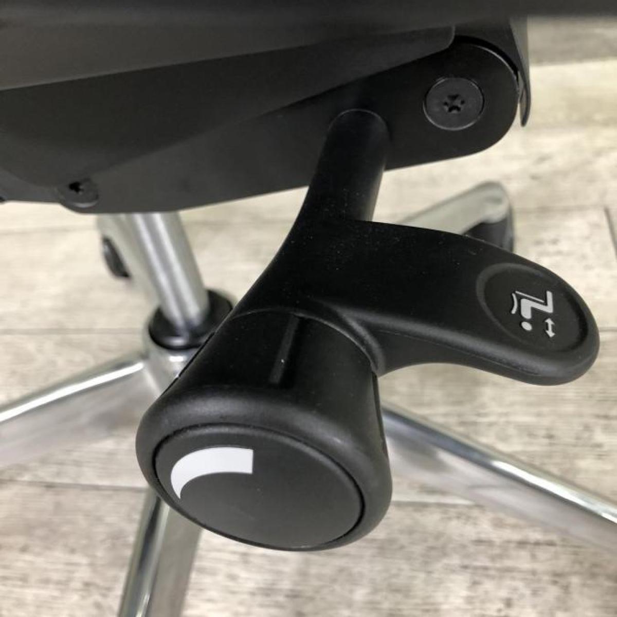 - 椅子と背が連動する「シンクロリクライニング」。リクライニング角度は直立ポジションから前方に10度、後方に23度です。