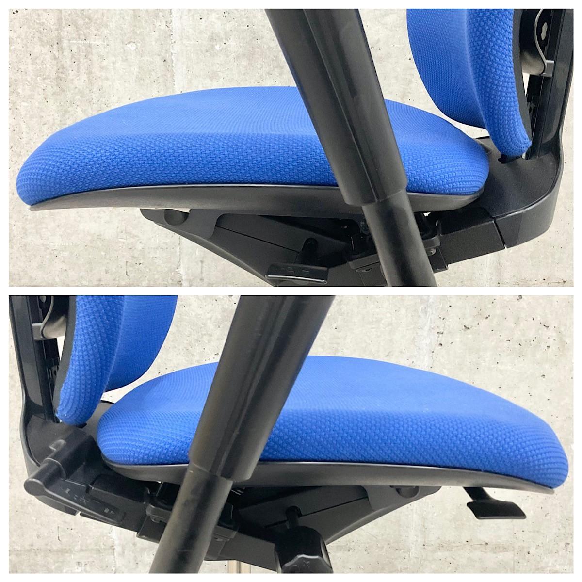 例えば、座面は、イトーキ独自の"ベンディングシート"という機構により、クッション、インターシェル、空洞という三層構造になっています。 この真ん中に挟まっているインナーシェルが、着座時の姿勢に合わせて体重を分散してくれるので、どんな姿勢でも体になじみ、疲労を軽減してくれます。 さらに、座面は前後に4センチほど奥行きを調整でき、前傾姿勢で座りたい、深く腰掛けたい、膝裏を圧迫されたくないなど、個人の好みに合った快適さにカスタマイズが可能となっています。