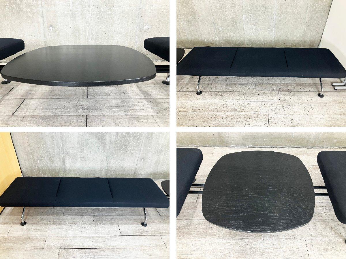 左右に3人掛けベンチを配し、その中央にテーブルを備えた構成で、待合やラウンジ空間に機能的かつ洗練された印象をもたらします。