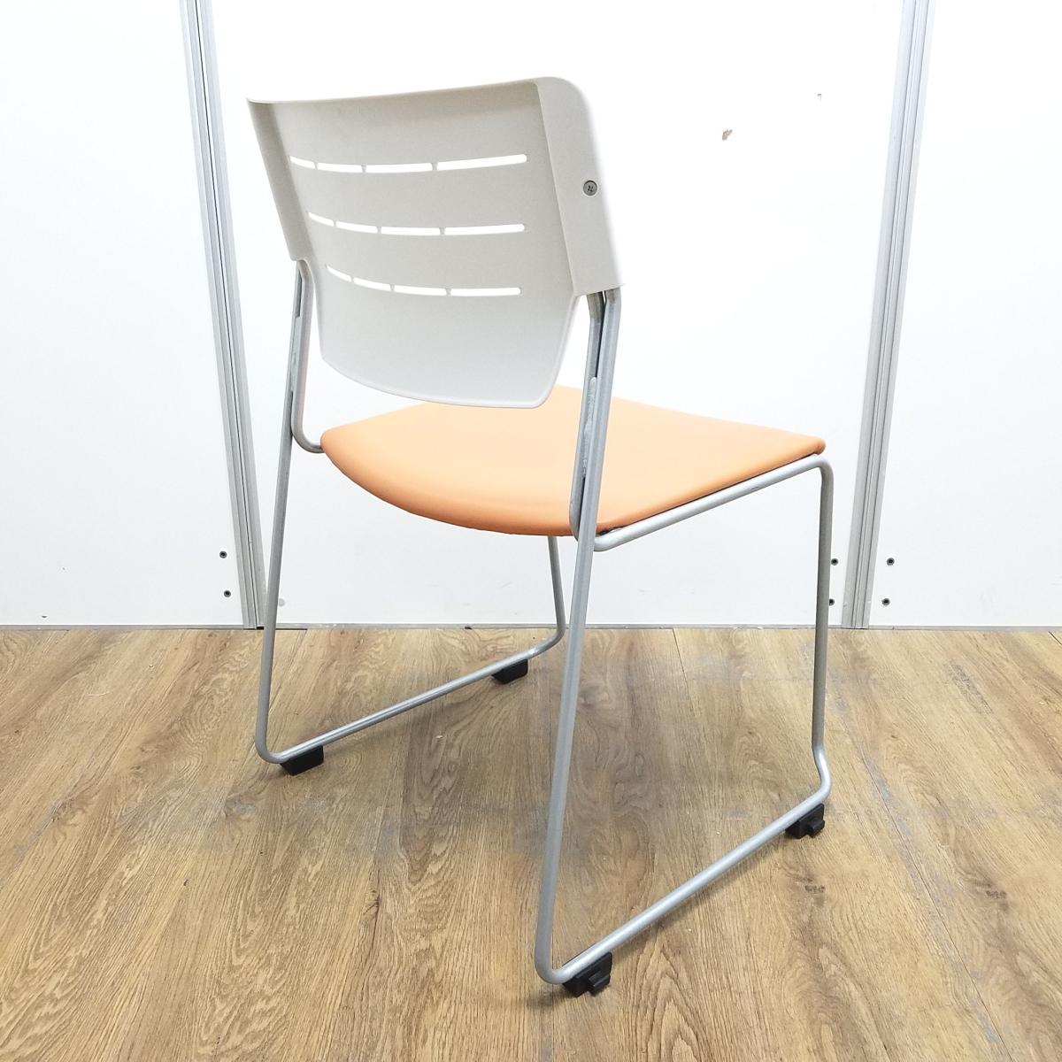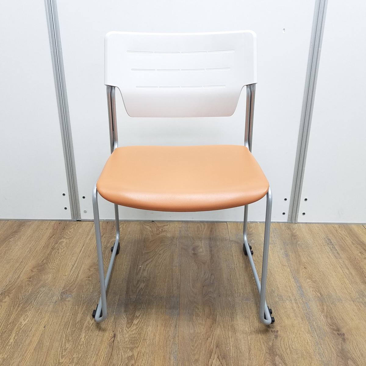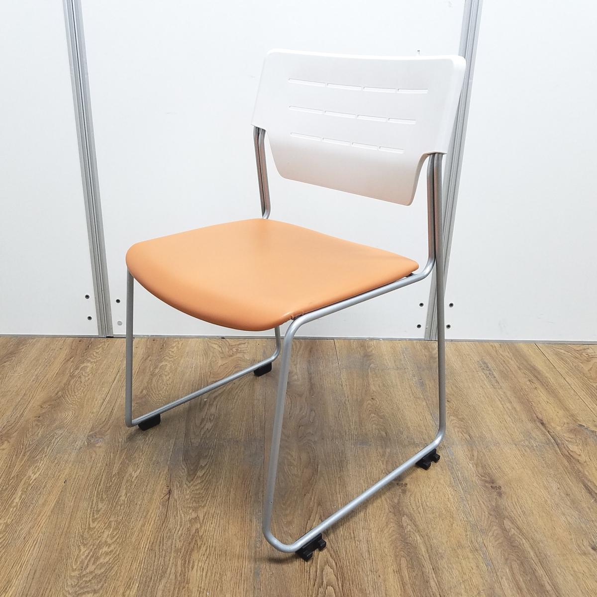イトーキ製 エレック ソフトオレンジ 背面樹脂オフホワイト 座面ビニールレザー キャスター無 重ねられるので収納にも困りません! ミーティングチェア スタッキングチェア!!- 京都東寺店