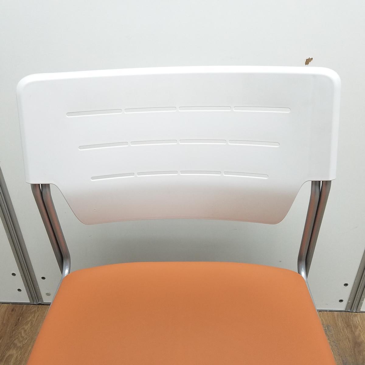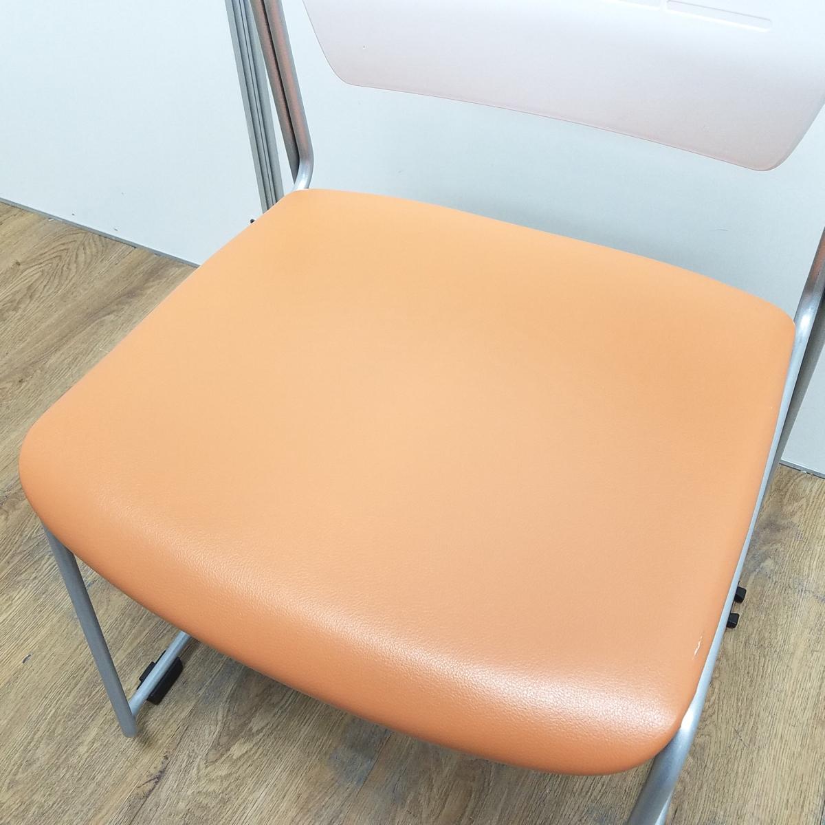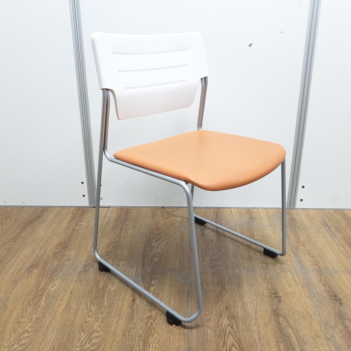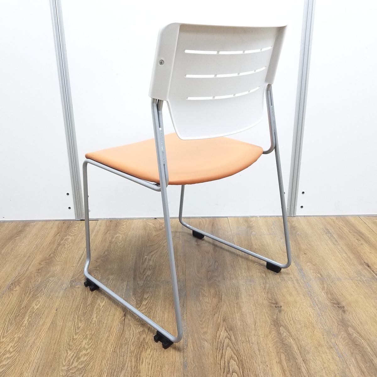 イトーキ製 エレック ソフトオレンジ 背面樹脂オフホワイト 座面ビニールレザー キャスター無 重ねられるので収納にも困りません! ミーティングチェア スタッキングチェア!!- 京都東寺店