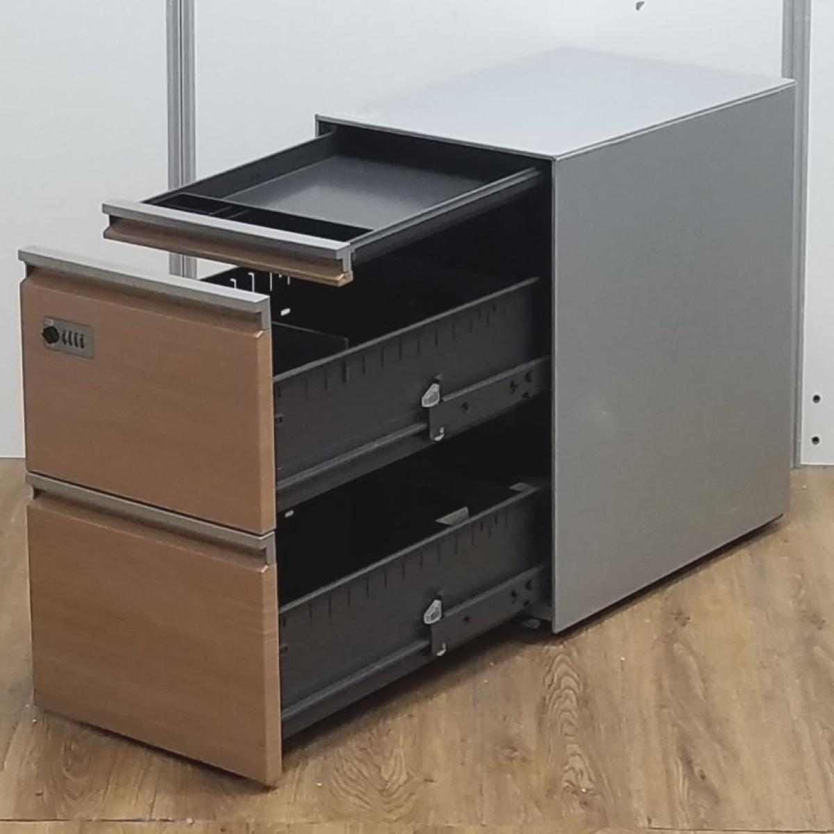 【商品入替のため、残り4台限り】オカムラ製 プロステージクレスト 木目調※プライズウッドミディアム スキップシルバー フリアド 3段 ワゴン H640サイズ ダイヤル錠 平机・フリーアドレスデスクのお供に! 珍しい表面ナチュラル木目調のおしゃれなワゴン! フリーアドレスデスク用3段ワゴン!!非常は解除キーは付属しておりません。- 京都東寺店