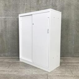 【スライド引き戸だから開閉スペースに困らない!】■コクヨ(KOKUYO)製 エディア(EDIA)シリーズ 2枚引き違い書庫 ローキャビネット シリンダー錠 天板付き ベース付き ホワイト シリンダー錠 収納 中古家具 格安 福岡 オフィス家具 九州最大級《オフィスバスターズ福岡博多店は、福岡を拠点として、日本全国へ中古オフィス用品・オフィス家具を提供しております》
