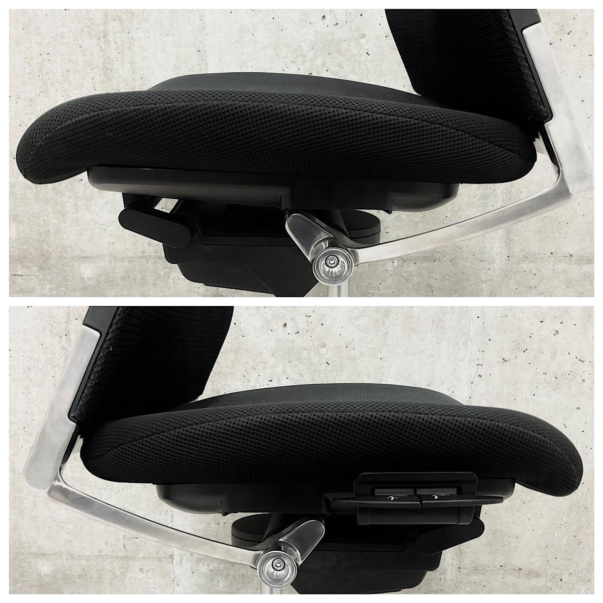 - 座る人の体格に合わせて、シート奥行きは前後54mm、高さ100mmの調整が可能です。また、調整レバーを座面シートの側面に設けることで、座ったままの姿勢で操作することができます。