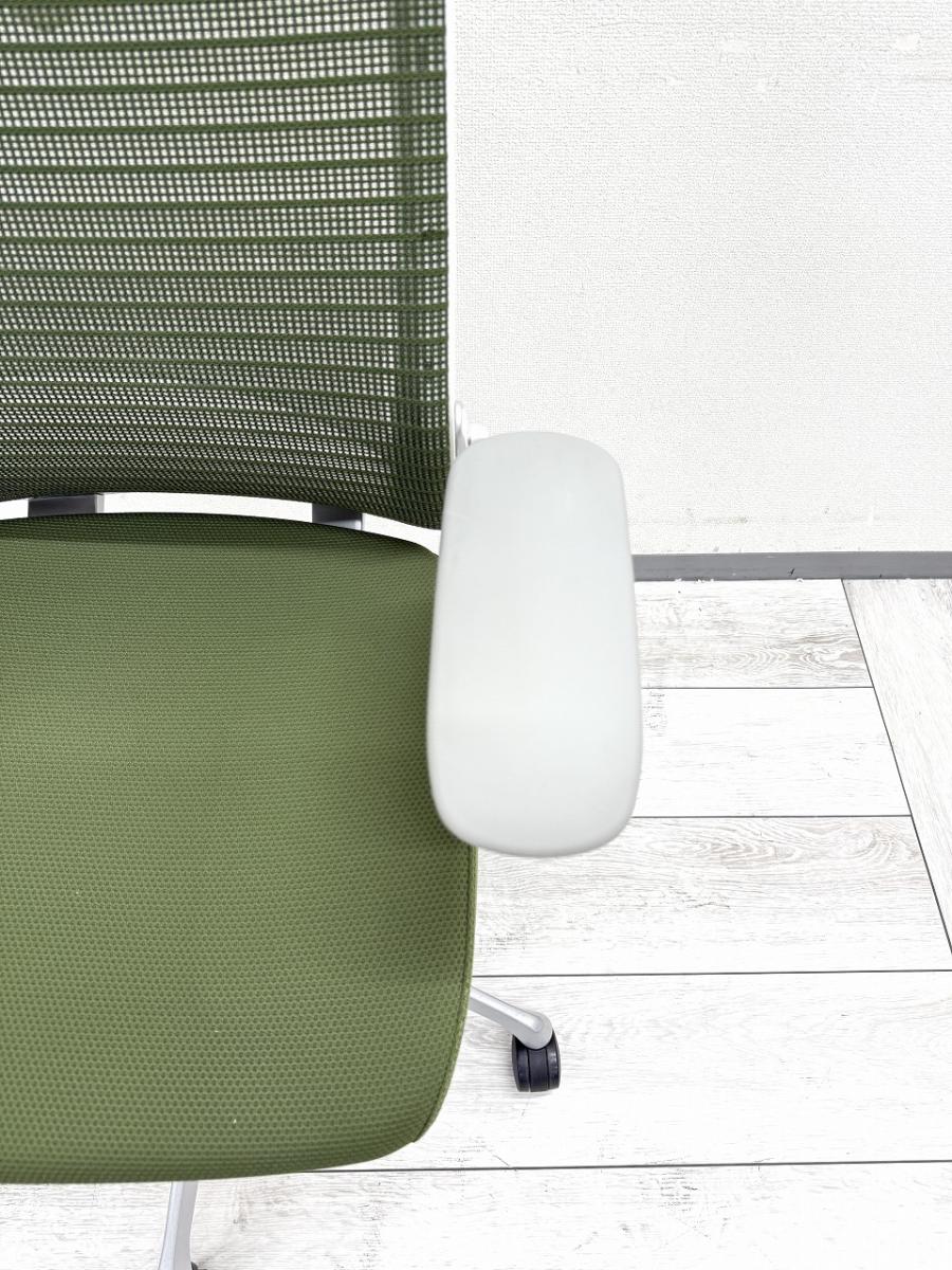 ★【T10】【商品入替のため、残り1脚限り】オカムラ製 コーラル(Choral) ライムグリーン ホワイトシェル ハイバック 肘付き メッシュ背面 アジャストアーム※可動肘 ハンガー付 どんな空間にも調和するデザインと最上級の操作性! 肘付きハイバックチェア!!【管理番号:A01024742】