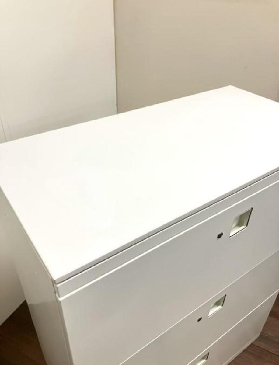 オカムラ レクトライン 3段ラテラル書庫 ホワイト天板 シリンダー錠 鍵付き ※取っ手部分に若干日焼けあり