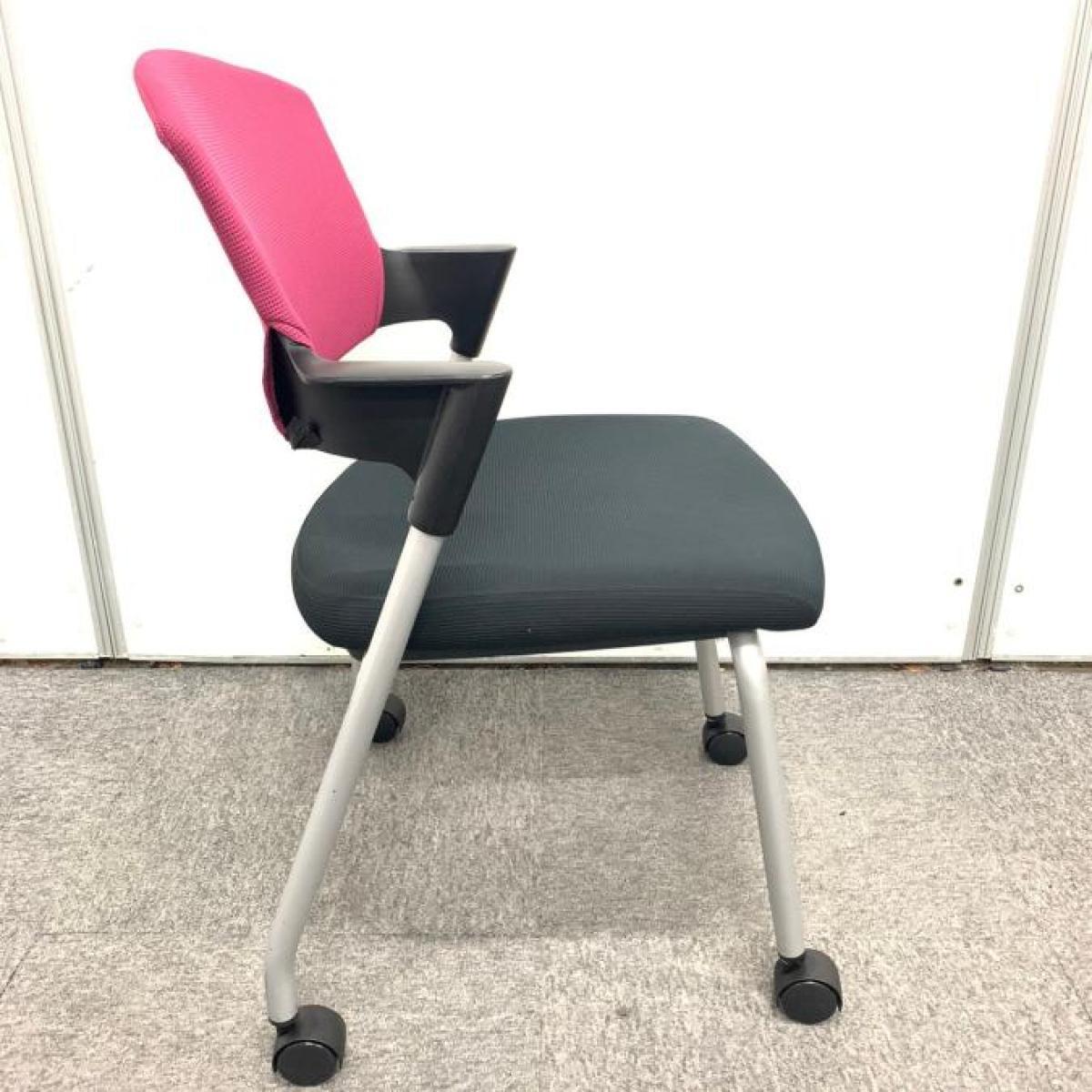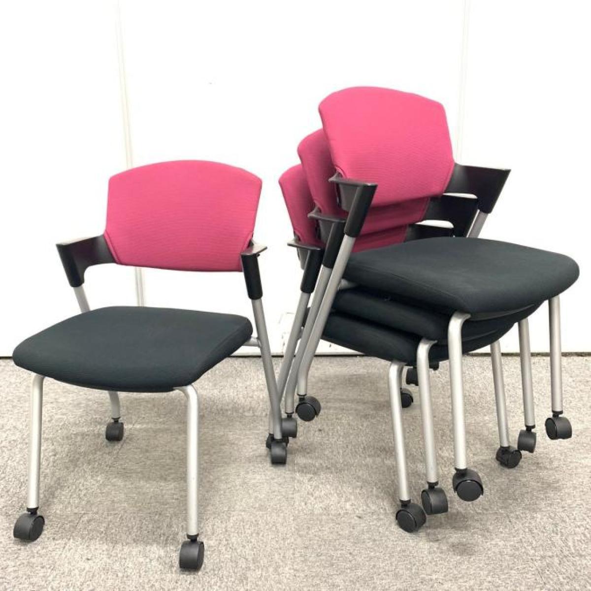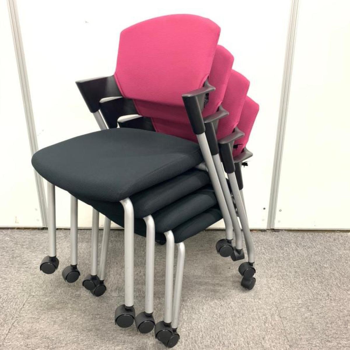 【シンプルスマートなスタッキングチェア!分厚いクッションで長時間でも快適な座り心地!】■コクヨ(KOKUYO)製 プロッティ(Protty) スタッキングチェア 肘付ミーティングチェア ■固定肘 ■キャスター付 ■ブラック ■背面パープルクッション〈岐阜・愛知・三重・静岡・福井〉- 在庫数