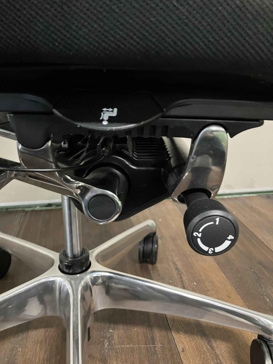 - ロッキングの強弱を調整するダイヤルがございます。体型に合わせてリクライニングの固さを座ったままで調整できます。