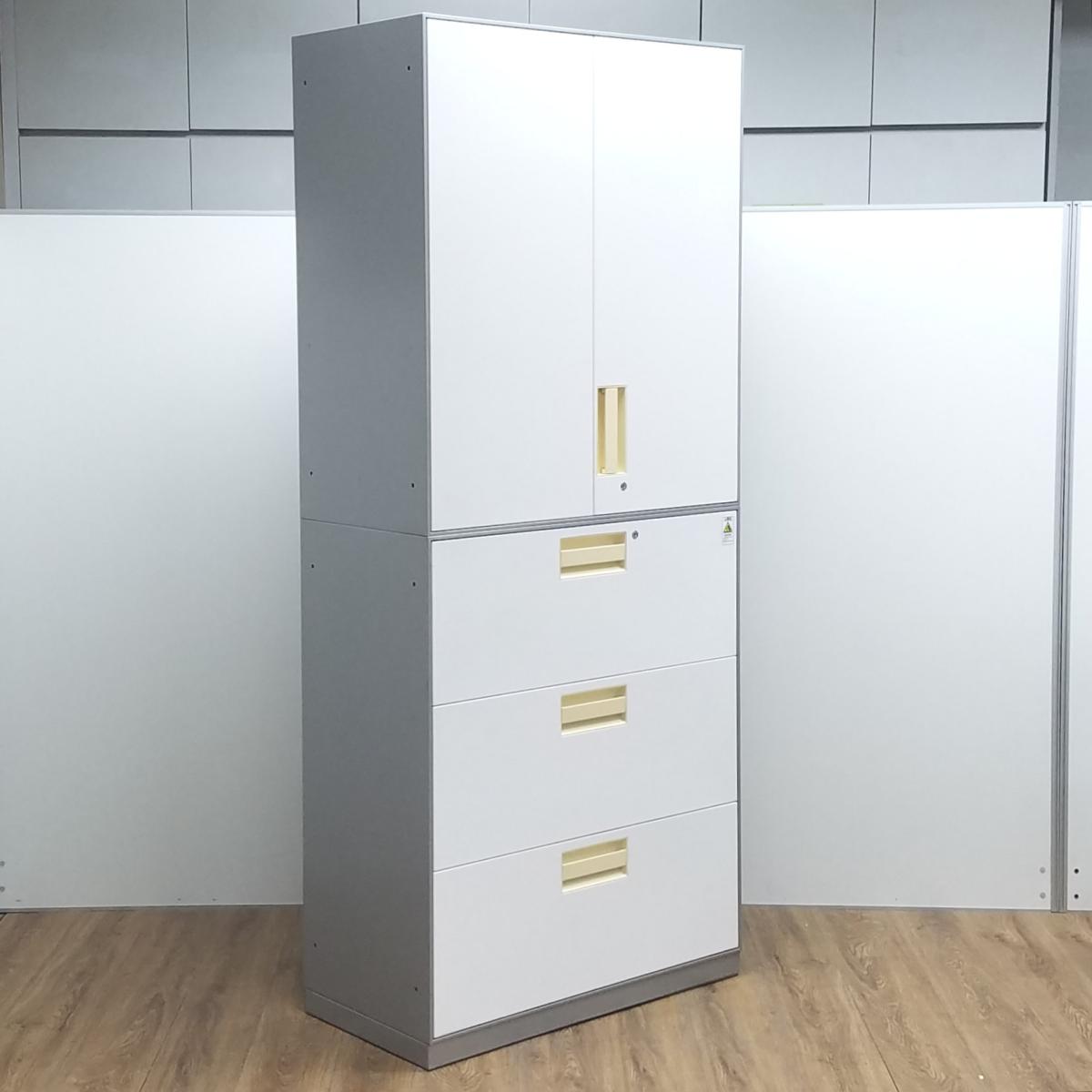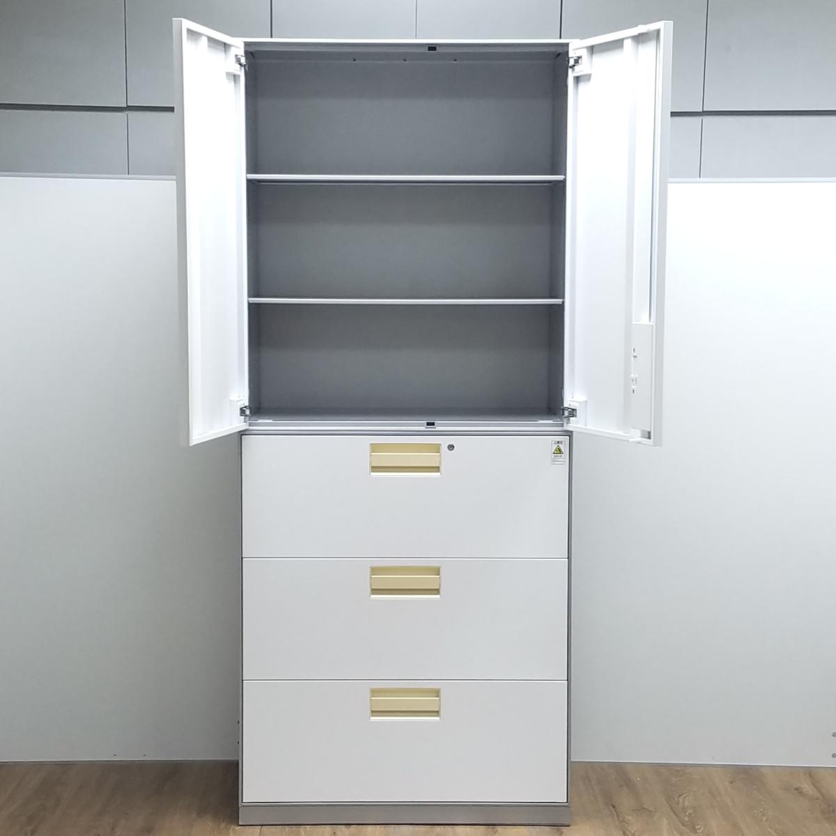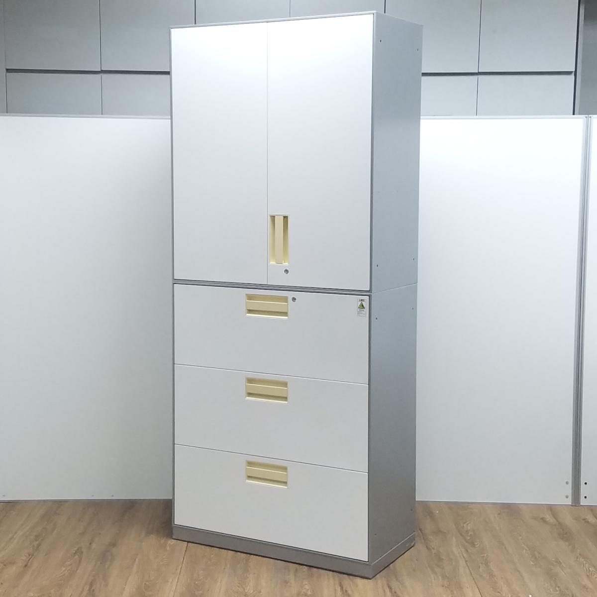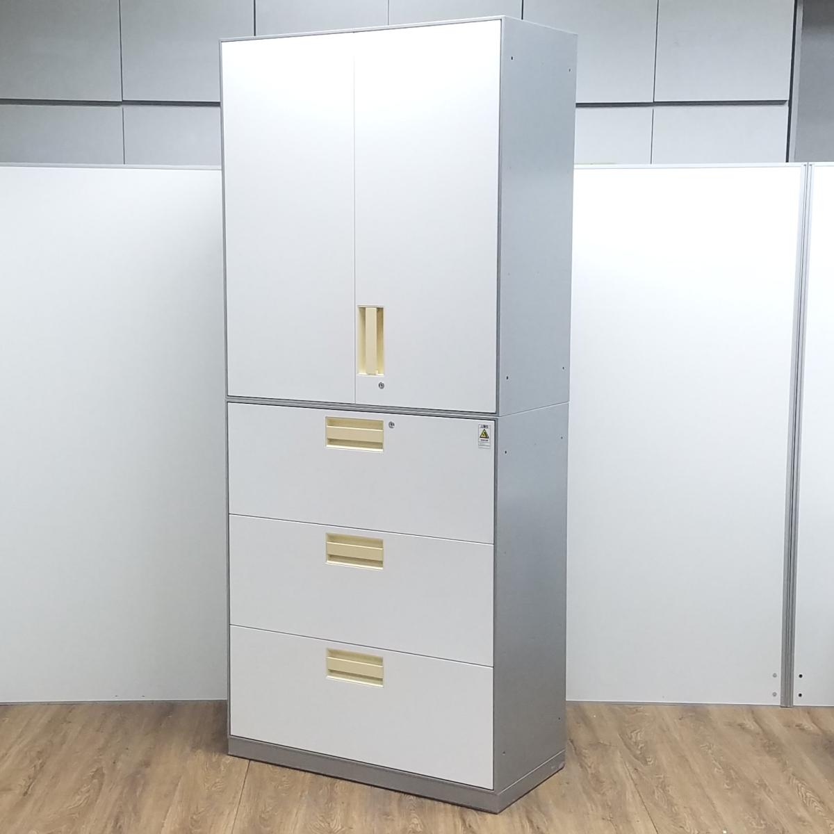 コクヨ製 ユニフレックス(UFX) 正面:ホワイトx側面:シルバー シリンダー錠 ※ラッチ日焼け有 すっきりとしたデザインの書庫セット! これ1台でオフィス書類をスッキリ整理! ハイキャビネット 両開き+3段ラテラル 上下書庫セット!!- 京都東寺店