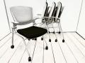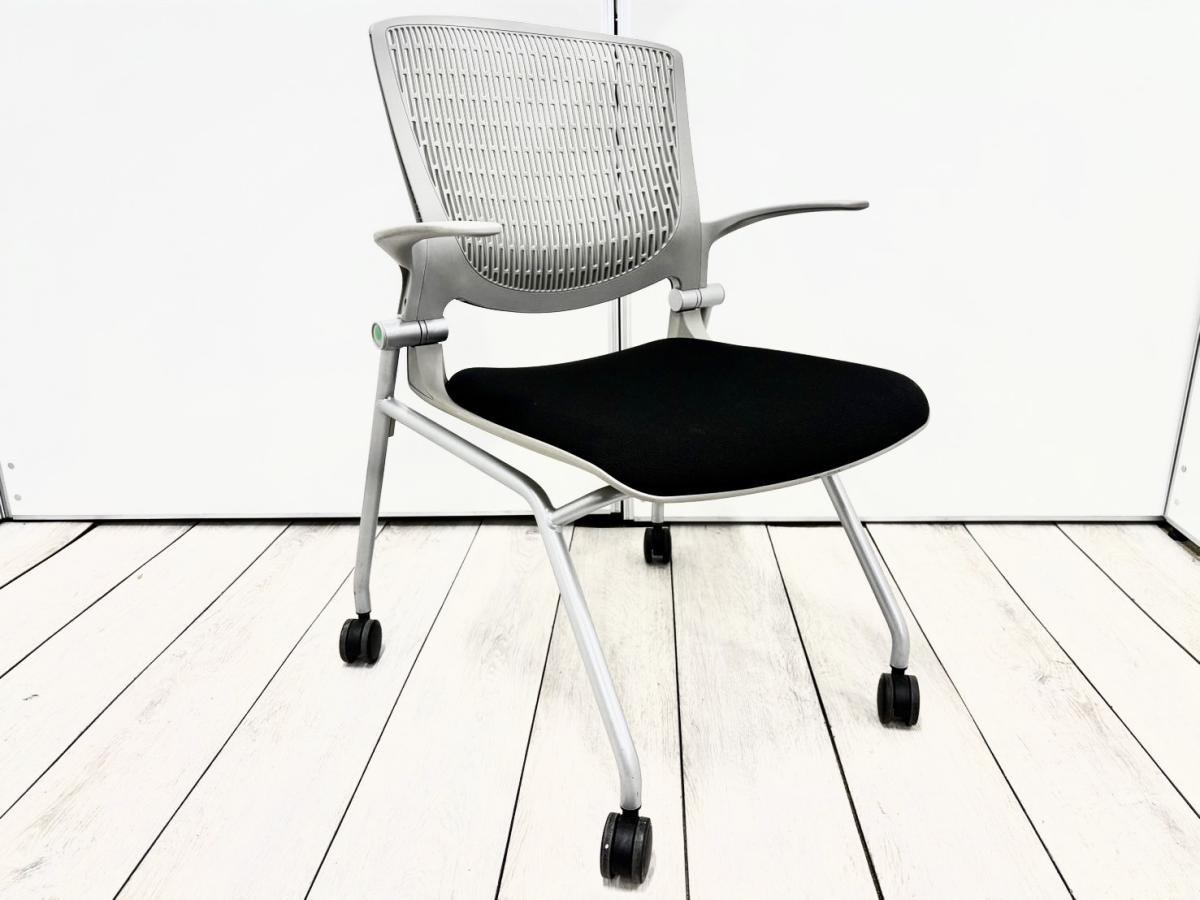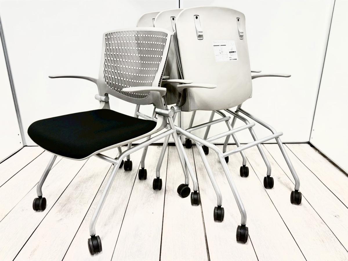 【4脚セット!】ミーティングスペースや休憩室に上質チェア!平行スタック可能な肘付のネスティングチェア! ■オカムラ/グラータ(Grata)/シルバー×ブラック キャスター付- 立川・八王子店