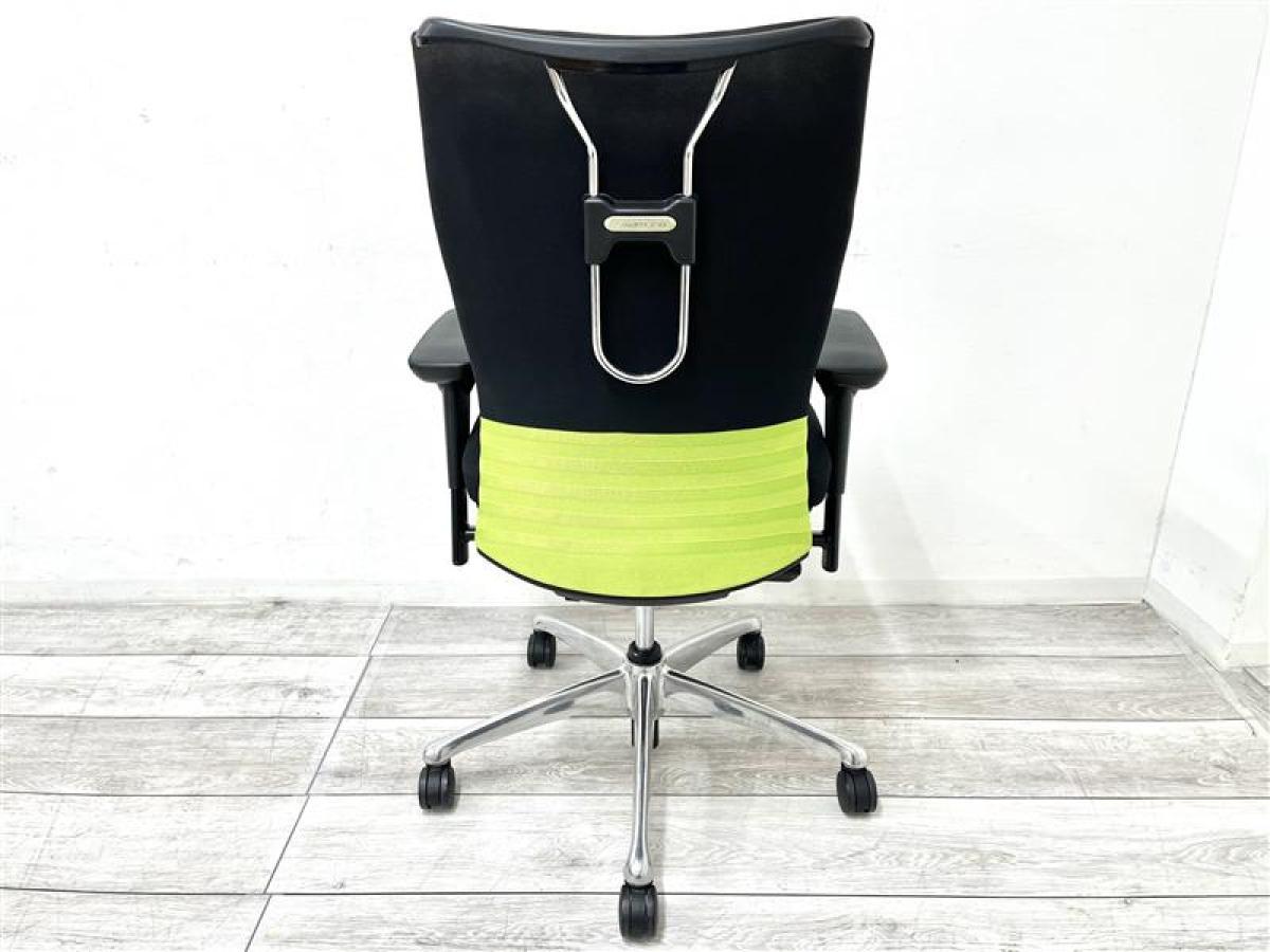【背あてのしなやかな曲線が背中にフィット!快適な座り心地に高級感のあるデザインが人気!】■オカムラ(okamura)製 フィーゴ(feego)チェア 肘付き ハイバック ■シームレスタイプ ■可動肘 ■ハンガー付き ■ライムグリーン ×ブラック