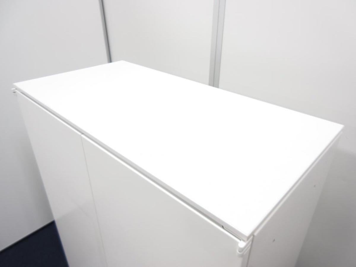 【オフィスの書類をスッキリ整理!取っ手がどの方向からでも開くマルチハンドル!】■オカムラ(okamura)製 レクトラインシリーズ 両開き書庫 ローキャビネット ■本体色:ホワイト ■シリンダー錠 ■ナチュラル天板付き