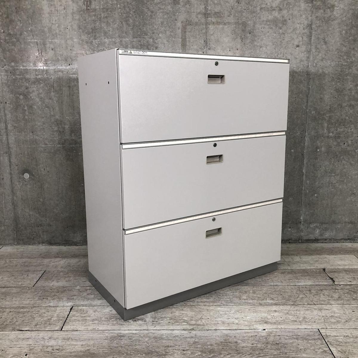 【書類をまとめて整理!引き出し式キャビネット】■イトーキ(ITOKI)製 シンラインシリーズ 3段ラテラル ニューグレー ※取っ手日焼けあり 《オフィスバスターズ福岡博多店は、福岡を拠点として、日本全国へ中古オフィス用品・オフィス家具を提供しております》