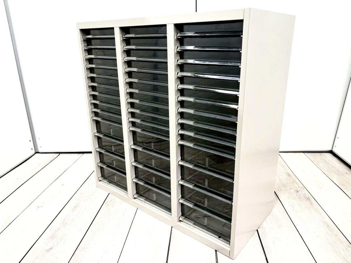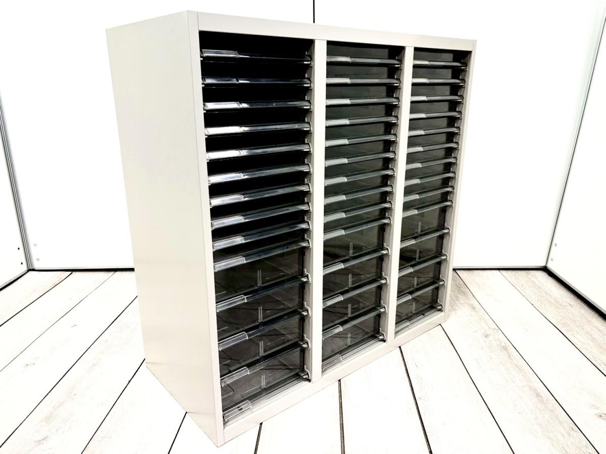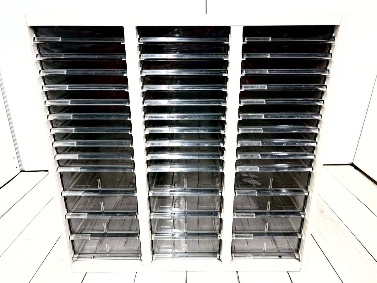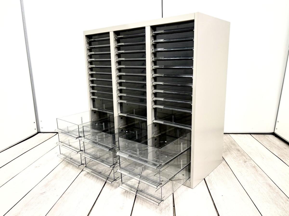 【限定1台!】コンパクトなクリスタルトレーキャビネットが入荷!(浅型10段+深型4段)×3列の計42段! ■オカムラ/クリスタルケースシリーズ/ライトスモーク- 立川・八王子店