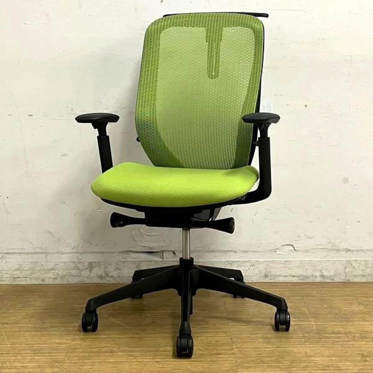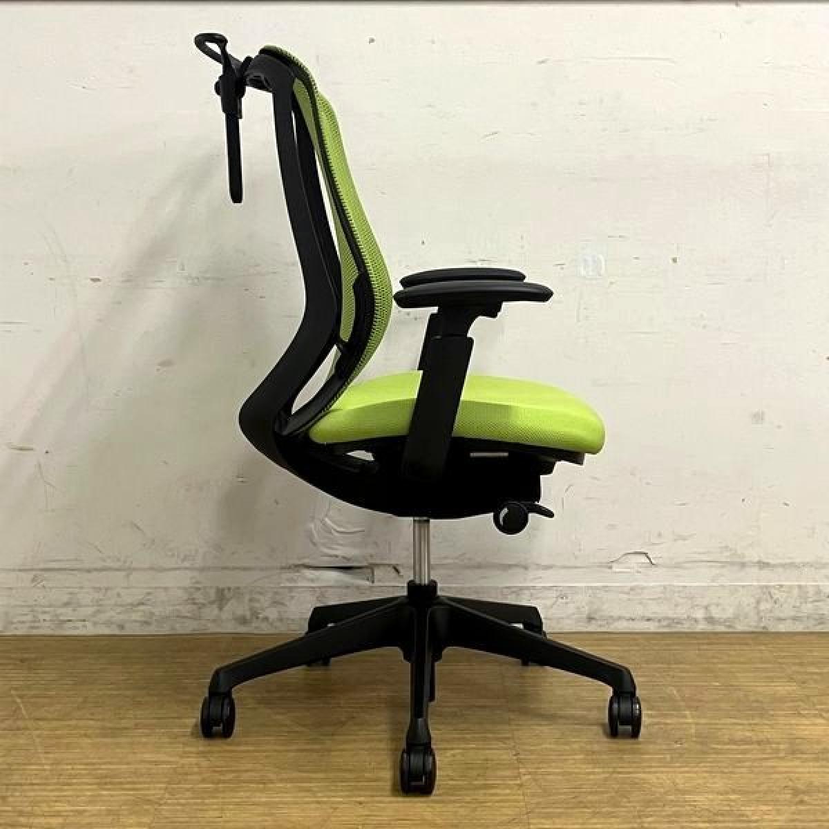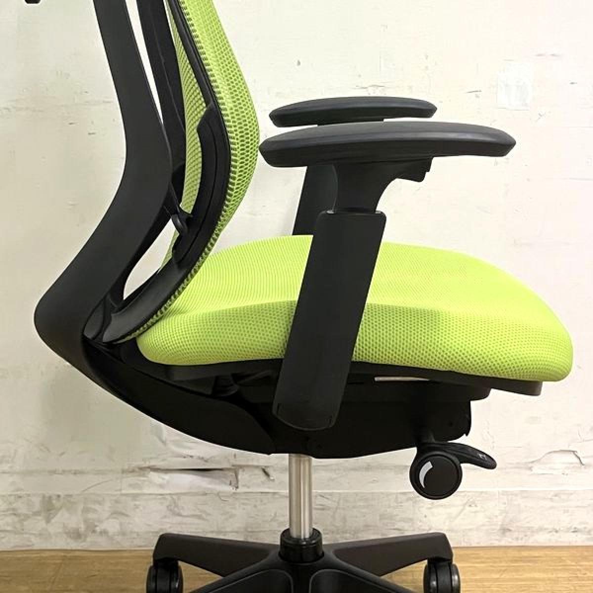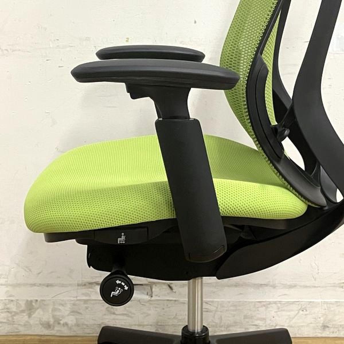 【いま人気のワーキングチェア!新感覚のオフィスシーティング!】■オカムラ シルフィーチェア 可動肘付 ライムグリーン ハンガー付 ※肘に擦れがあるためお安く!【前傾チルト機能付】【A01040979】