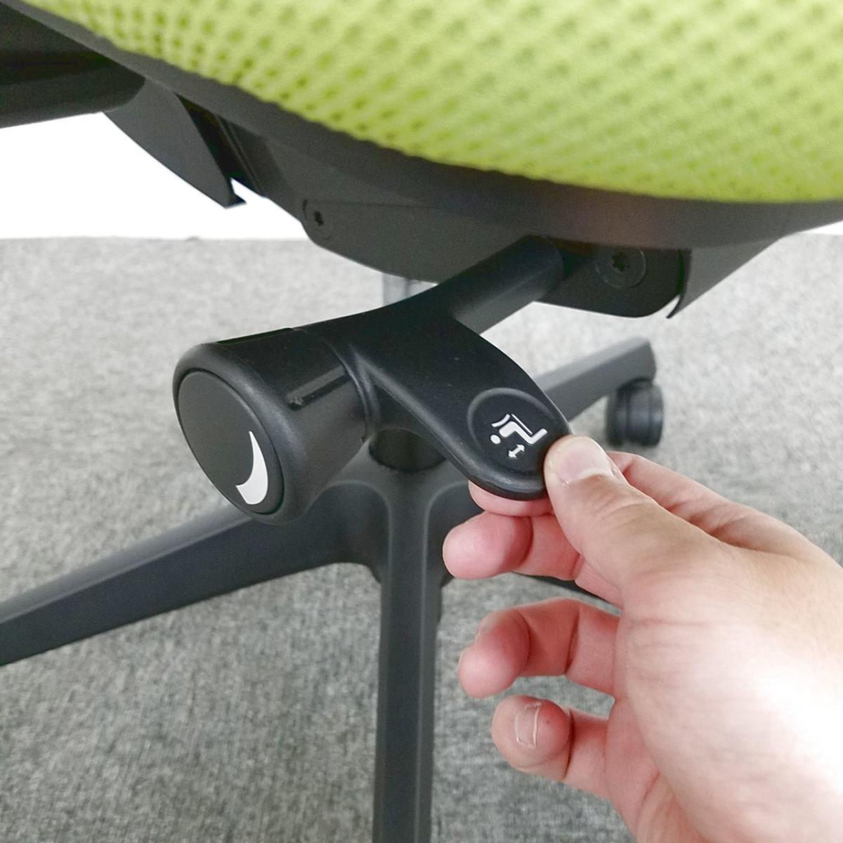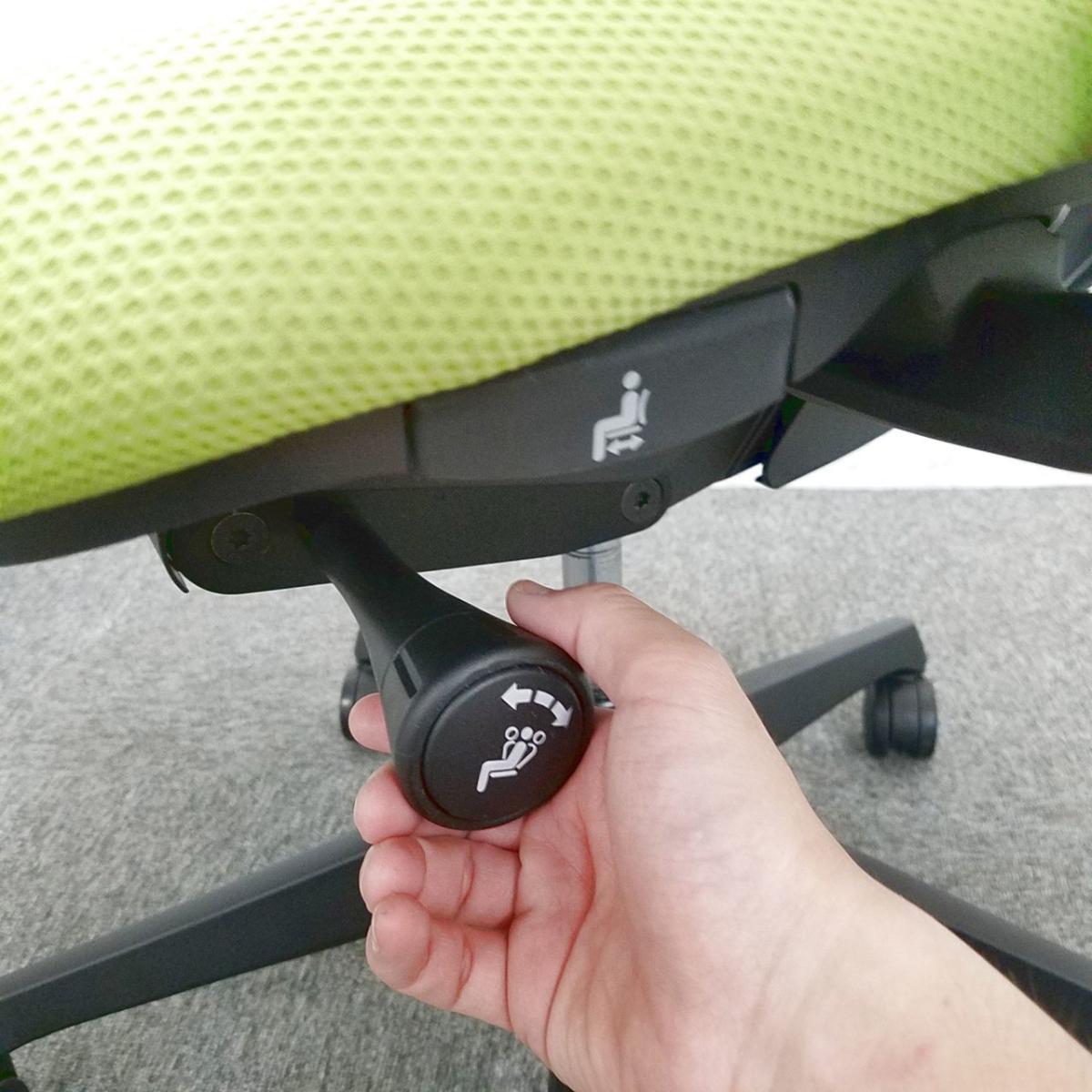 - 座面右下のダイヤル操作で、リクライニングの強弱調整が行えます。これまでのダイヤル式よりも、少ない回転数で、最弱?最強の調整が可能です。