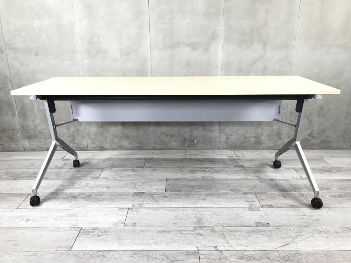 【会議・研修室などに・使わないときは畳んで省スペース!】■コクヨ(KOKUYO)製 リーフライン(Leafline)シリーズ サイドスタックテーブル フラップテーブル W1800×D600㎜ ■木目ナチュラル天板 ■幕板付き 【2~3名での使用に最適】