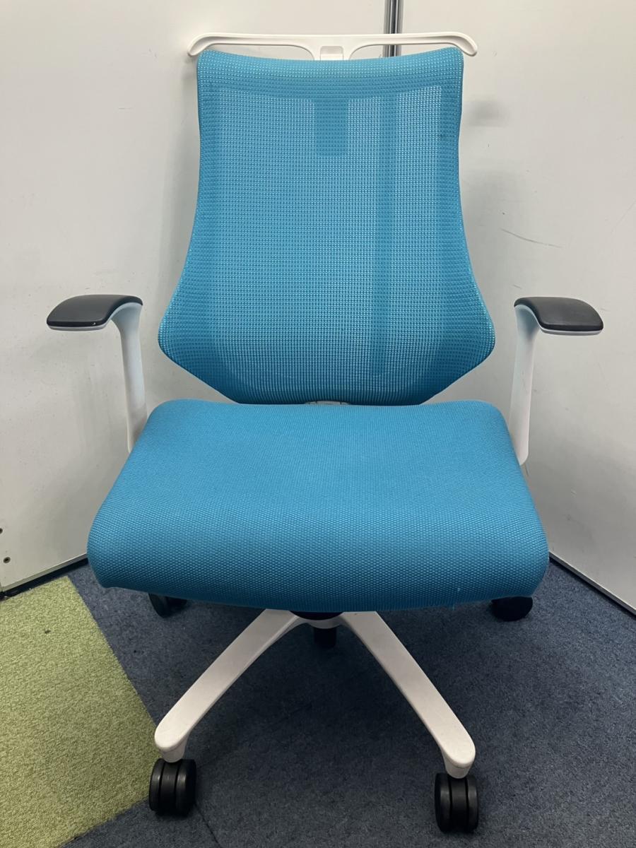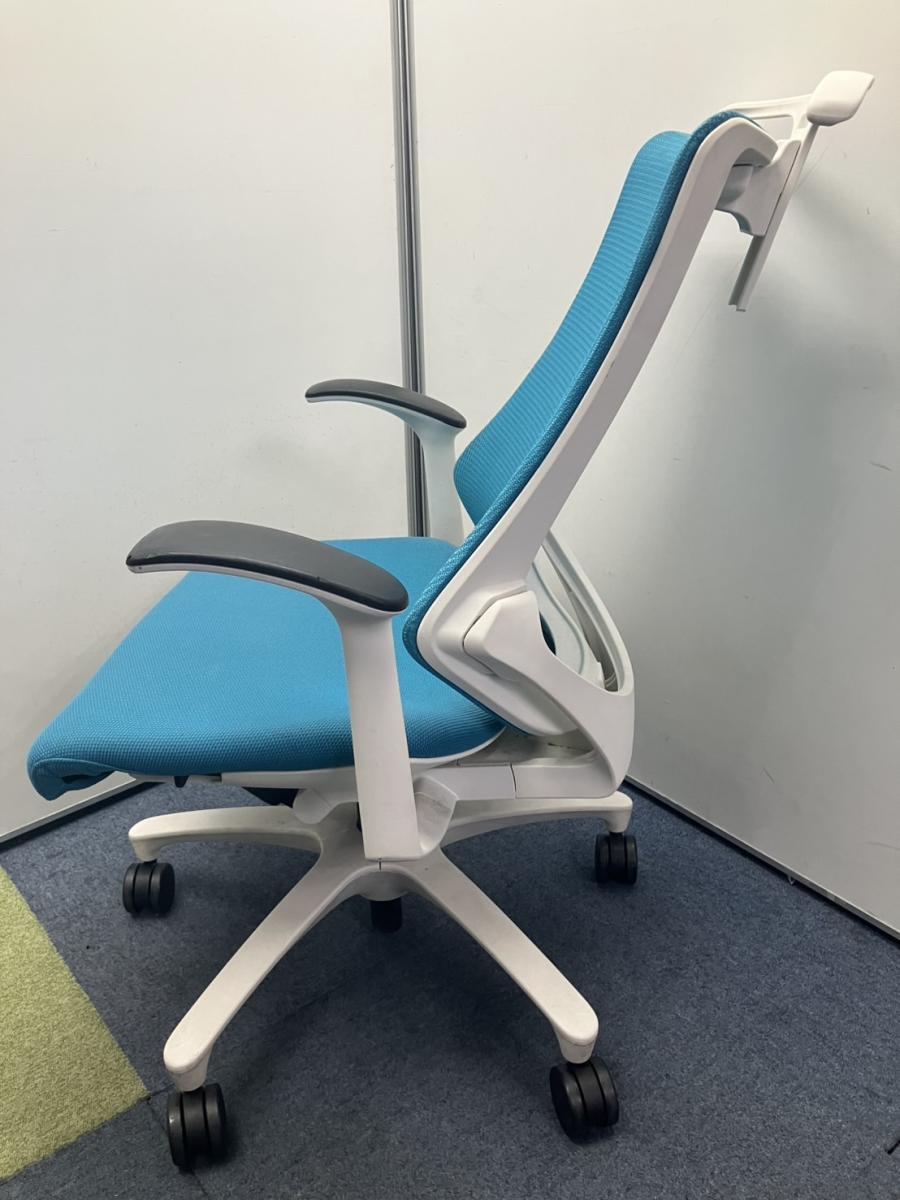 【姿勢の変化にフレキシブルに対応!スタイリッシュで座り心地も抜群な高機能チェア】■イトーキ(ITOKI)製 エフ(f)チェア 肘付き ハイバック 背面メッシュ ■可動肘・ハンガー付 ■ストロングブルー×ホワイトシェル ※日焼け有