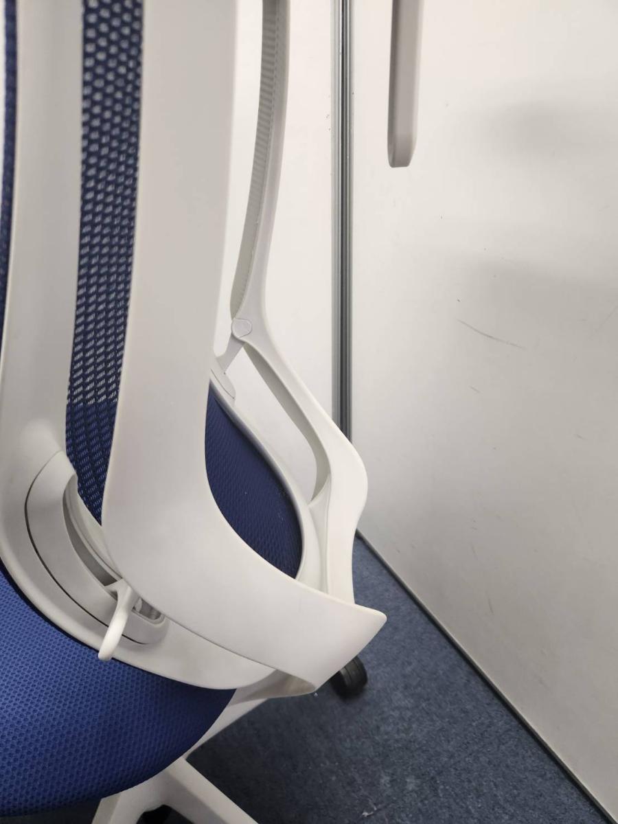 大人気【前傾チルト機能付き】【オカムラ製品で最も人気を集める高機能メッシュチェア!】■オカムラ製 シルフィ(Sylphy) 肘付き ハイバック 背面メッシュ ■ハンガー付き ■ブルー×ホワイトシェル- 名古屋本店