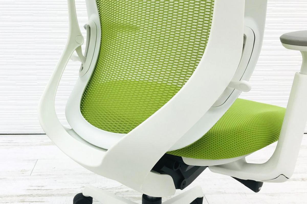 【ワーカーを支える機能を多数持つ人気チェア!優しい座り込みで姿勢も安定!】■オカムラ製 シルフィー 肘付ハイバックチェア 背面メッシュ ■可動肘 ■座面:ライムグリーン 脚:ホワイト オフィスバスターズ 東大阪店