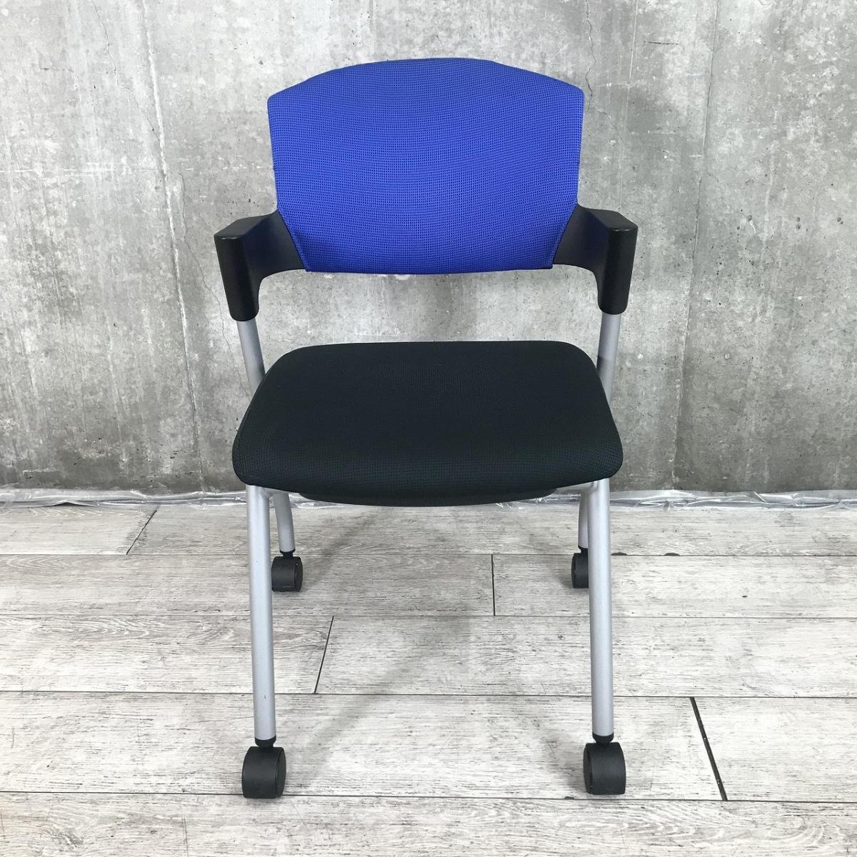 【シンプルスマートなスタッキングチェア!分厚いクッションで長時間でも快適な座り心地!】■コクヨ(KOKUYO)製 プロッティ(Protty) スタッキングチェア 肘付ミーティングチェア ■固定肘 ■キャスター付 ■ブラック ■背面ブルークッション〈岐阜・愛知・三重・静岡・福井〉- 岐阜店