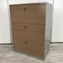 【西】【珍しいカラーリング!高品質で使いやすい人気の3段引き出し式書庫!】■オカムラ(okamura)製 レクトラインシリーズ 3段ラテラル書庫 ローキャビネット ■本体:シルバー 天板・正面・背面:木目調ブラウン 左側面:化粧板付 ■シリンダー錠