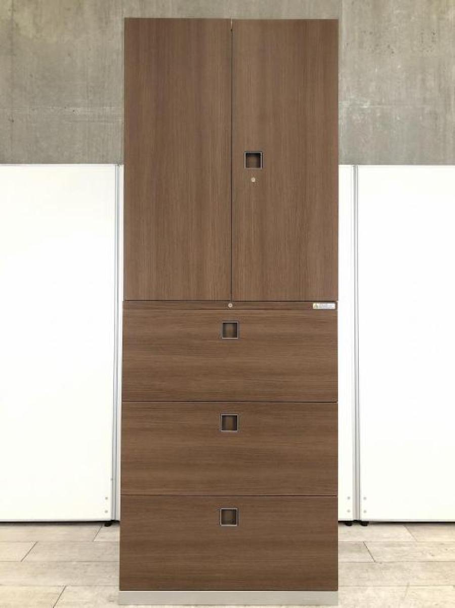 【珍しい木目調&両開き+3段ラテラルのセット書庫!木目カラーがオシャレ!】■オカムラ レクトライン 両開き+3段ラテラル ハイキャビネット ■シルバー×扉ブラウン 【弊社使用欄:A01036854/A01036852】- なんば日本橋店