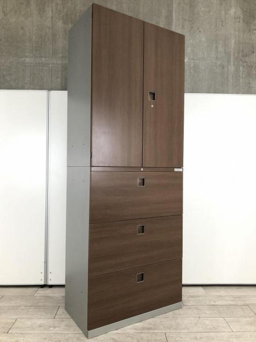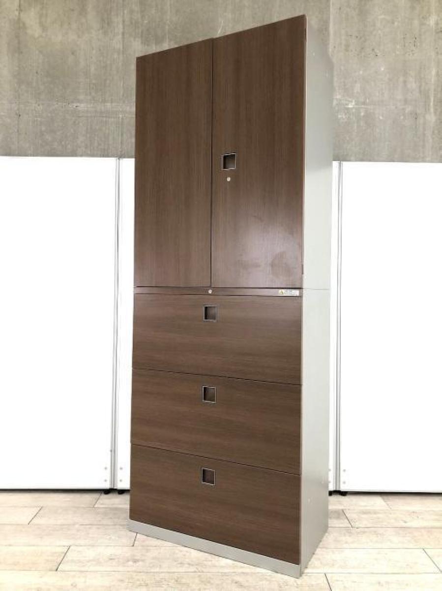 【珍しい木目調&両開き+3段ラテラルのセット書庫!木目カラーがオシャレ!】■オカムラ レクトライン 両開き+3段ラテラル ハイキャビネット ■シルバー×扉ブラウン 【弊社使用欄:A01036854/A01036852】在庫がある店舗一覧