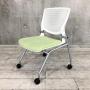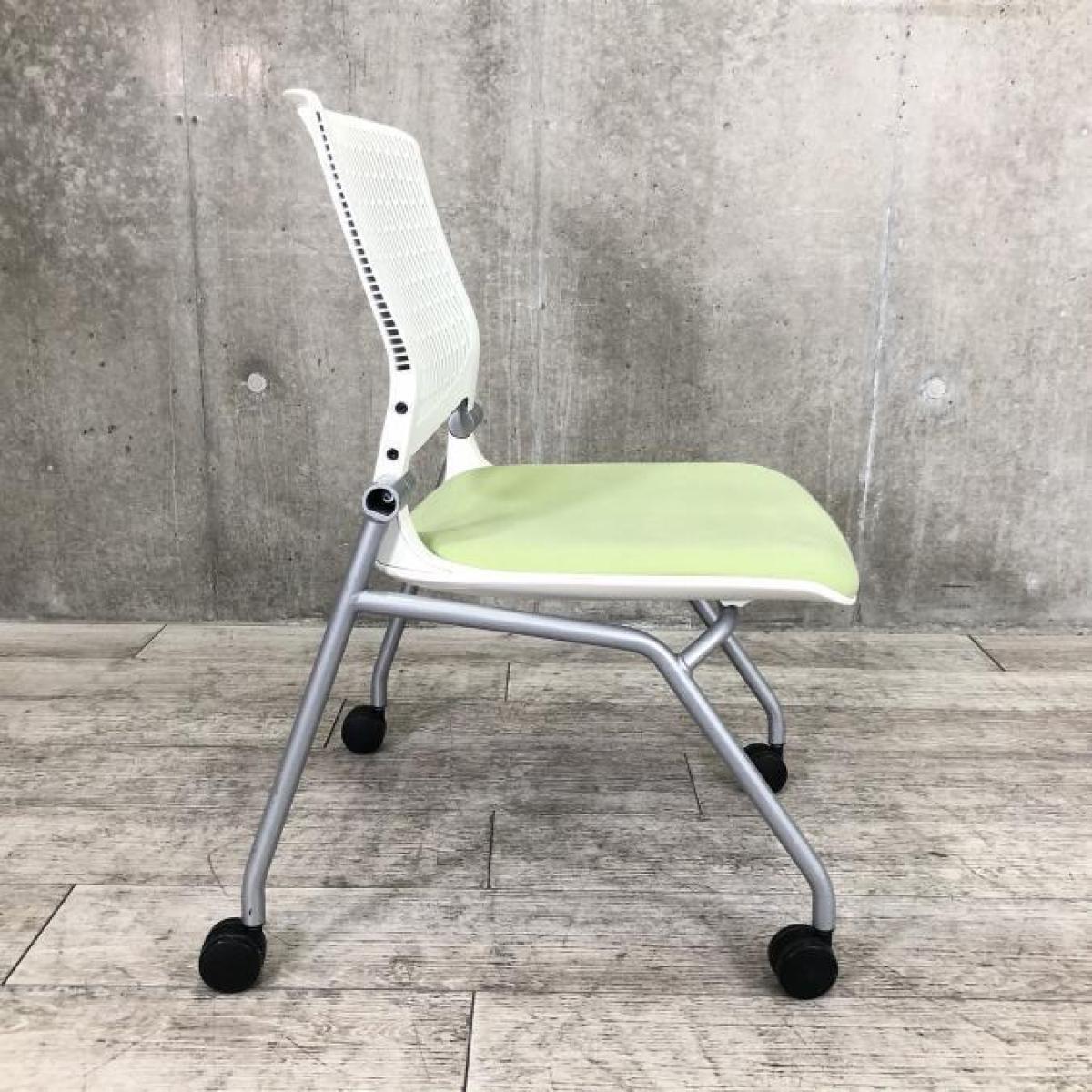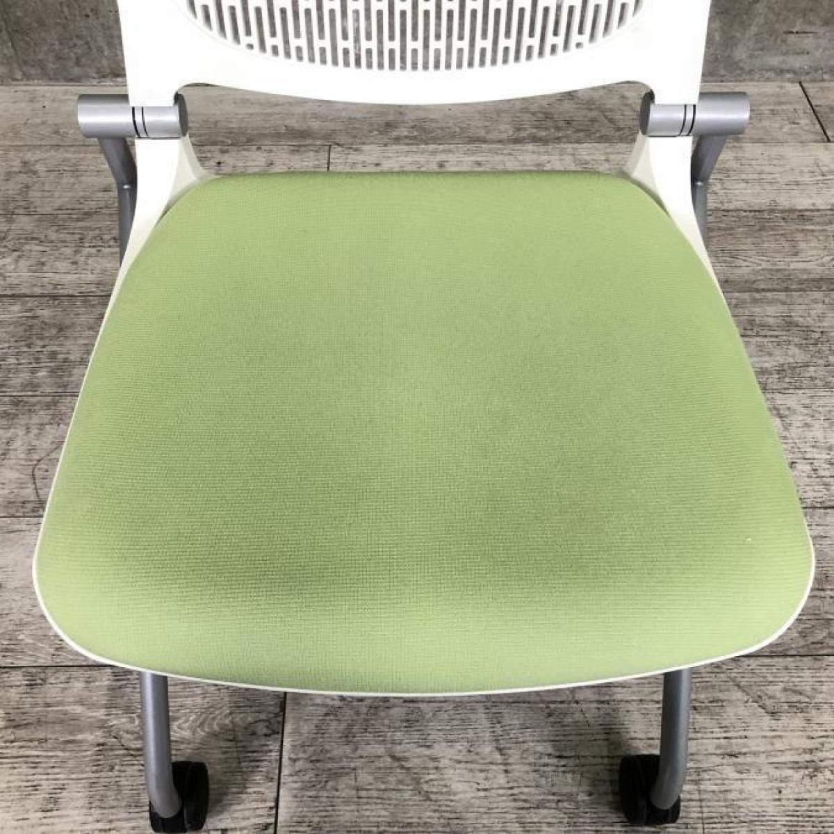 【しなやかにワーカーを受け止める洗練されたデザイン】【使わないときは平行スタックで収納!】■オカムラ(okamura)製 グラータ (Grata) 肘無し ミーティングチェア ネスティングチェア ■背面: 樹脂メッシュ(ホワイト) 座面:グリーン ■キャスター付- オフィスチェア店
