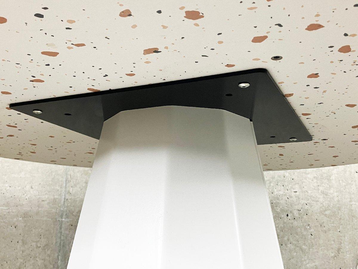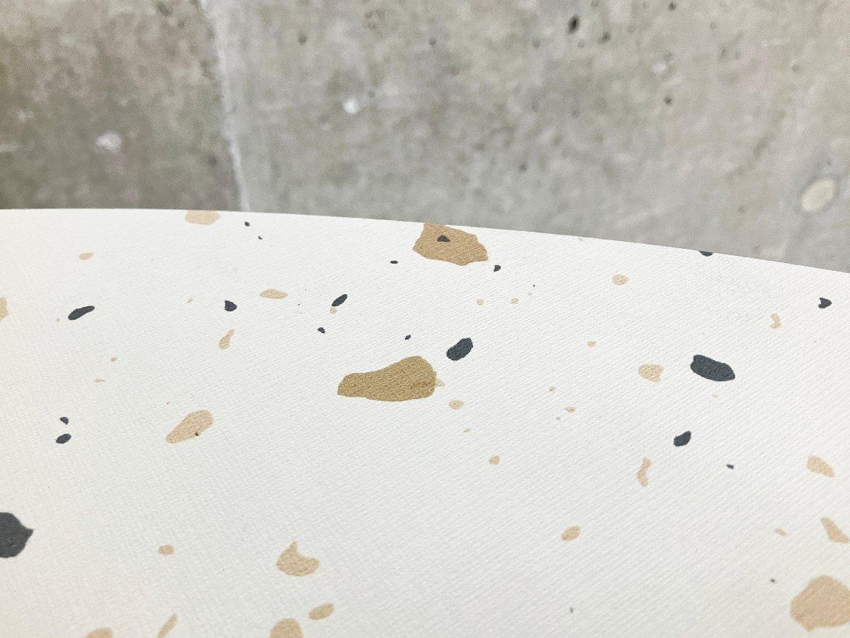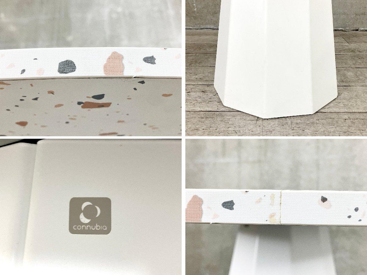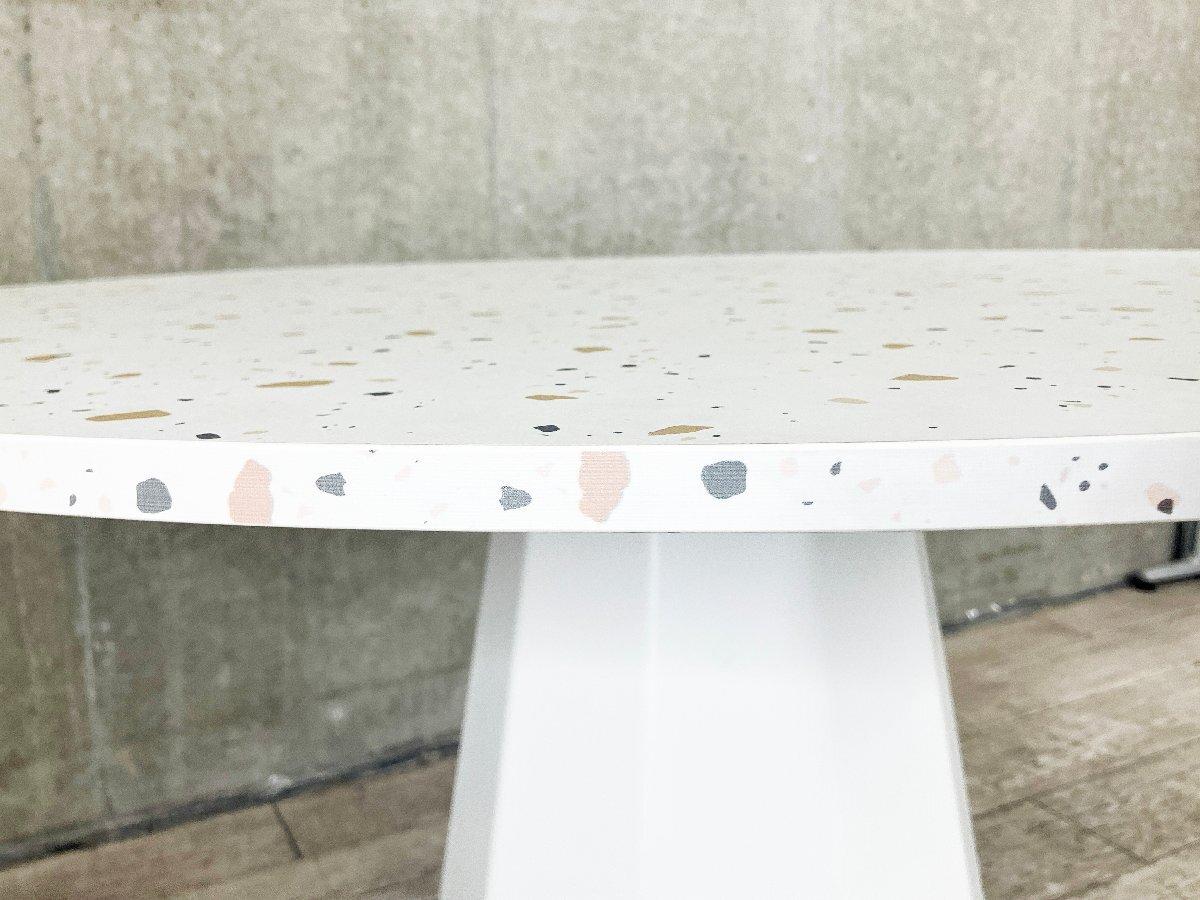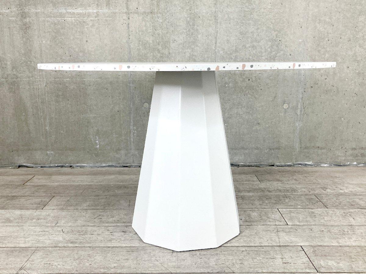 10面の円錐形台座が空間に独自の存在感をもたらし、天板(メラミン4種)と脚部(メタル3色)の組み合わせによって多彩なスタイルを演出します。洗練されたデザインは、ご自宅はもちろん、オフィスや店舗空間にも上質な彩りを添えます。