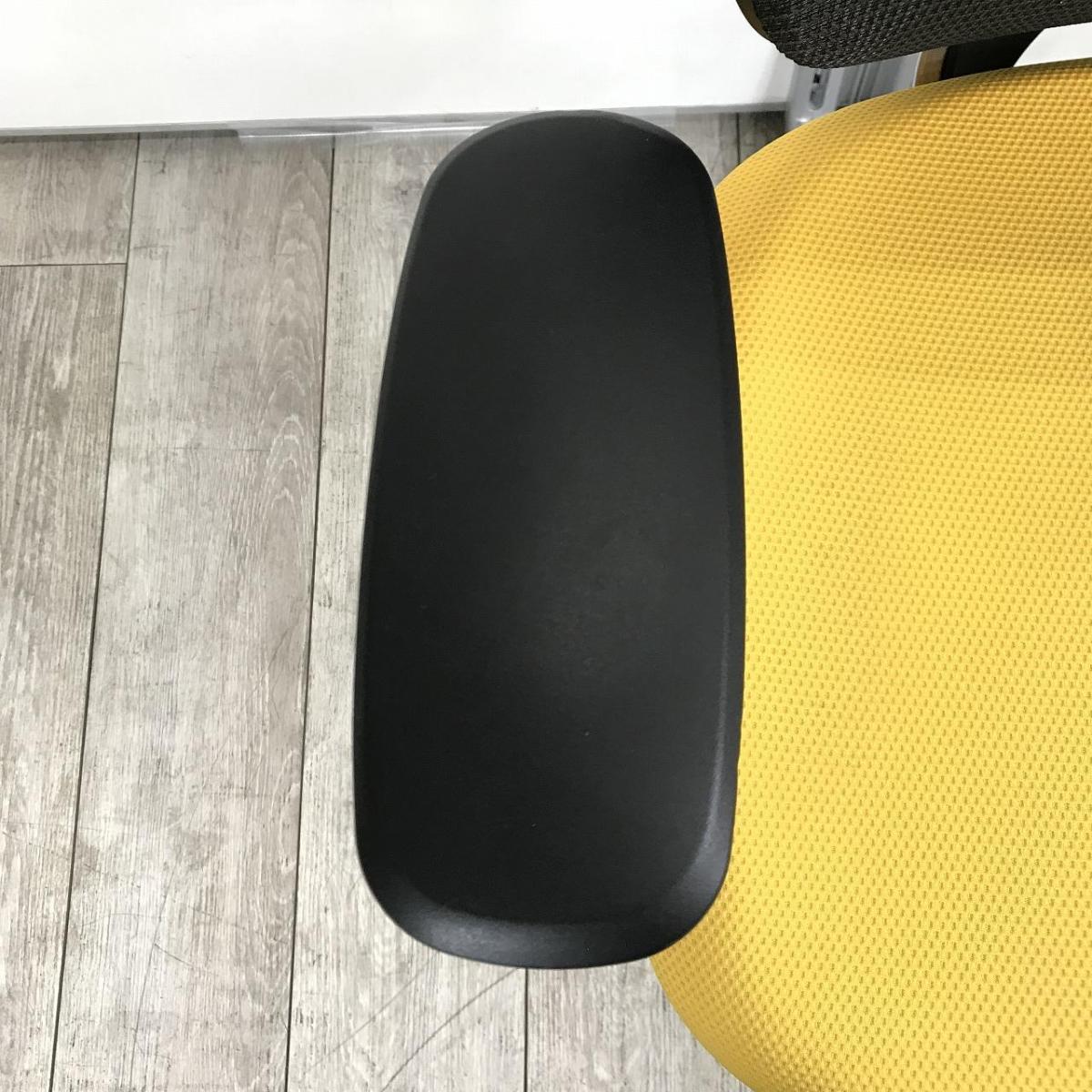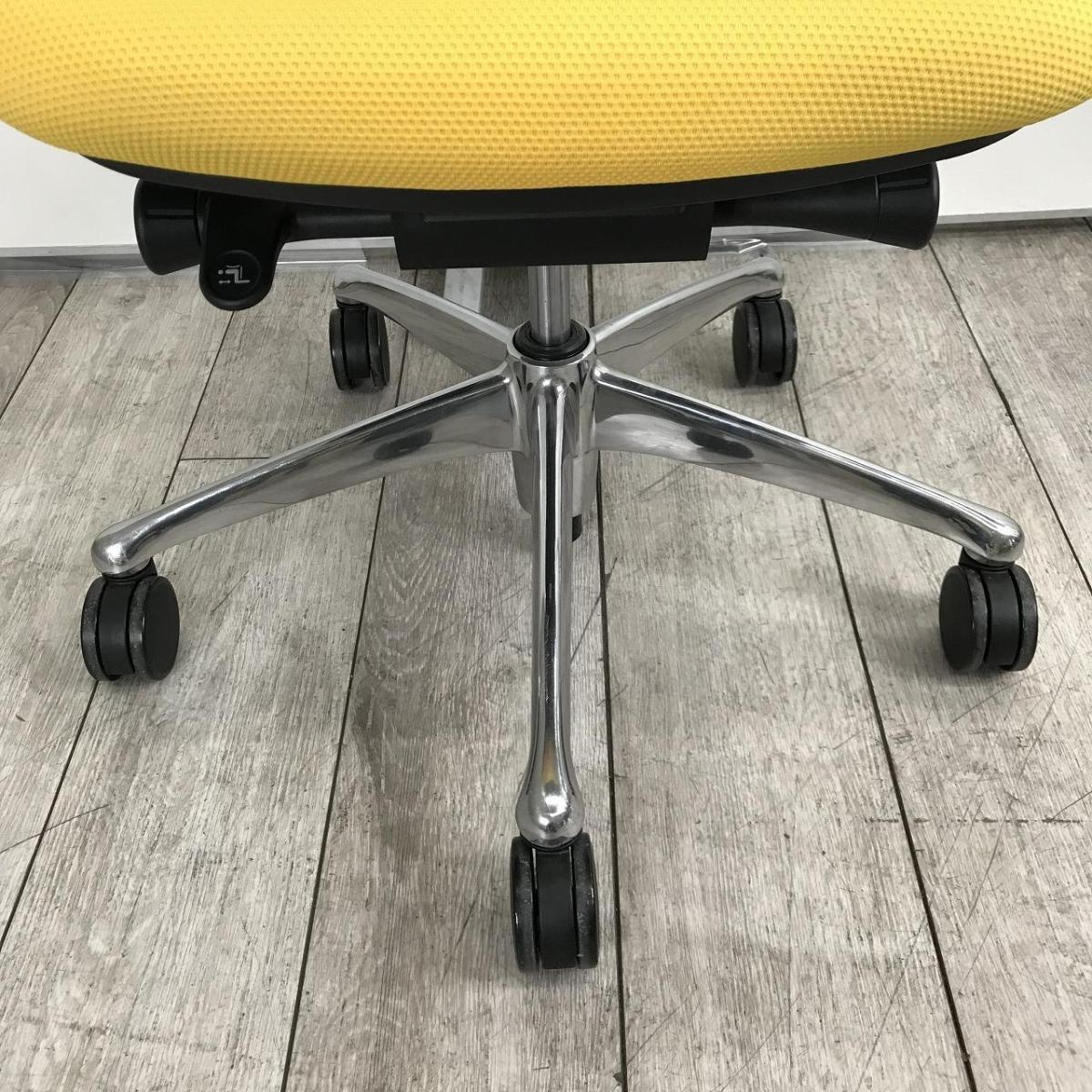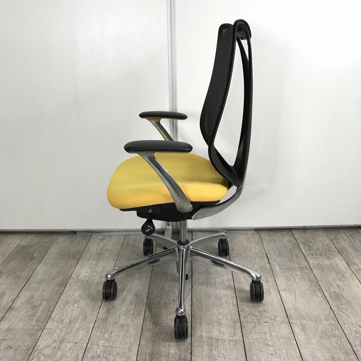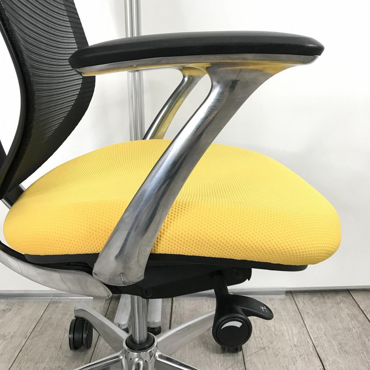 【上質な座り心地のオフィスシーティング!メッシュで快適に!】 ■オカムラ(okamura)製 サブリナ (Sabrina) 肘付ハイバック ■固定肘 ■背もたれメッシュ ■マンゴーイエロー 【状態良好品!】【入替セールにつき30%OFF!】- つくば店