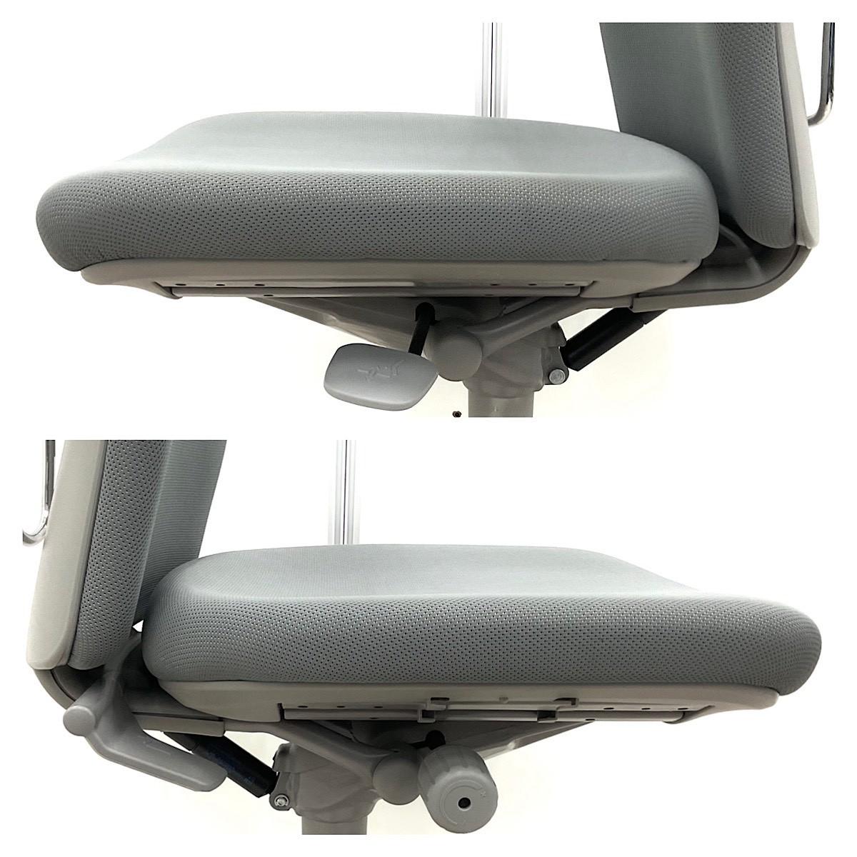 もう一つは、オカムラ社独自の""異硬度クッション""が座面に採用されていることです。これは座面が位置により異なる硬さのウレタンでできており、前方は腿裏を圧迫しないようソフトに、後方はしっかりと体重を支えるために少し硬めに作られています。クッション性とホールド感の両立により、長時間の作業での疲れを軽減してくれます。"