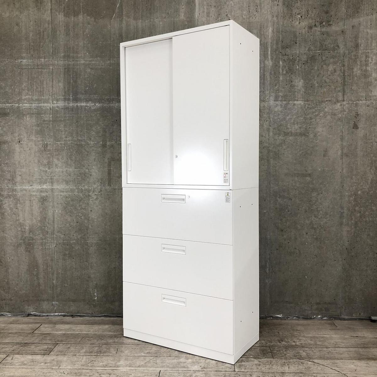 【オフィスの書類をまとめて整理!引き違いと引き出し式の書庫セット!】■コクヨ(KOKUYO)製 エディア(EDIA) 引き違い+3段ラテラル 上下書庫セット 2枚扉 H2150㎜ ■シリンダー錠 ■ホワイト- つくば店