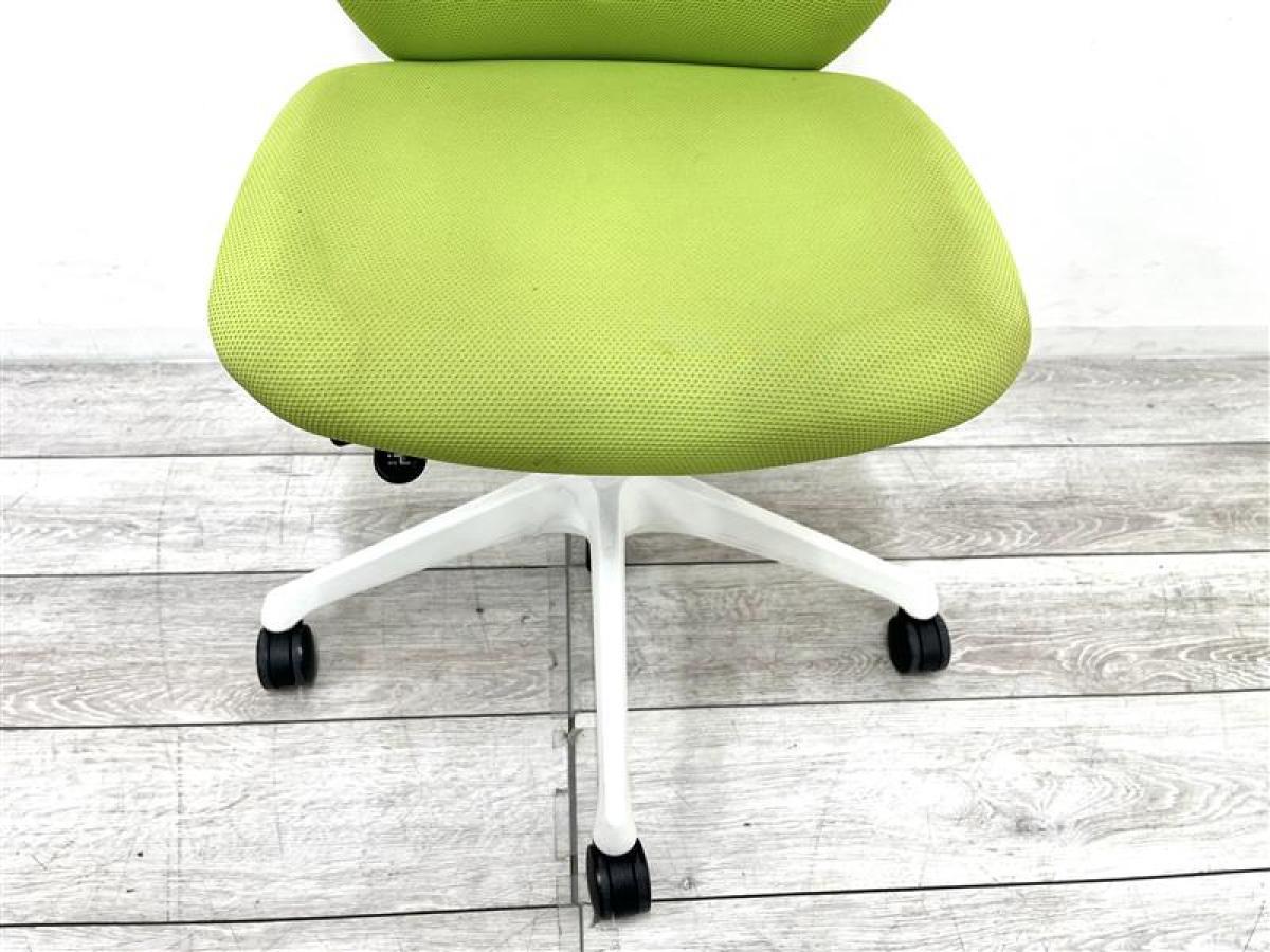 オカムラ製 シルフィーシリーズ ライムグリーン ホワイトフレーム 背面クッション コートハンガー付き 快適な座り心地を実現! 人気シリーズの背面クッションモデル! 肘無しハイバックチェア!!