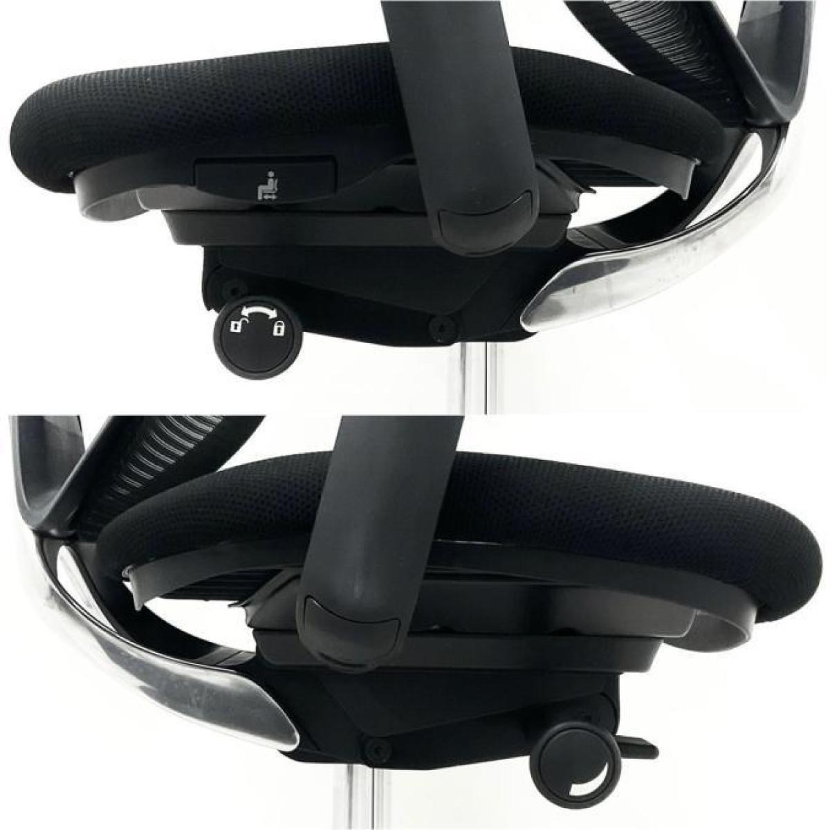 - 椅子と背が連動する「シンクロリクライニング」。リクライニング角度は直立ポジションから前方に10度、後方に23度です。